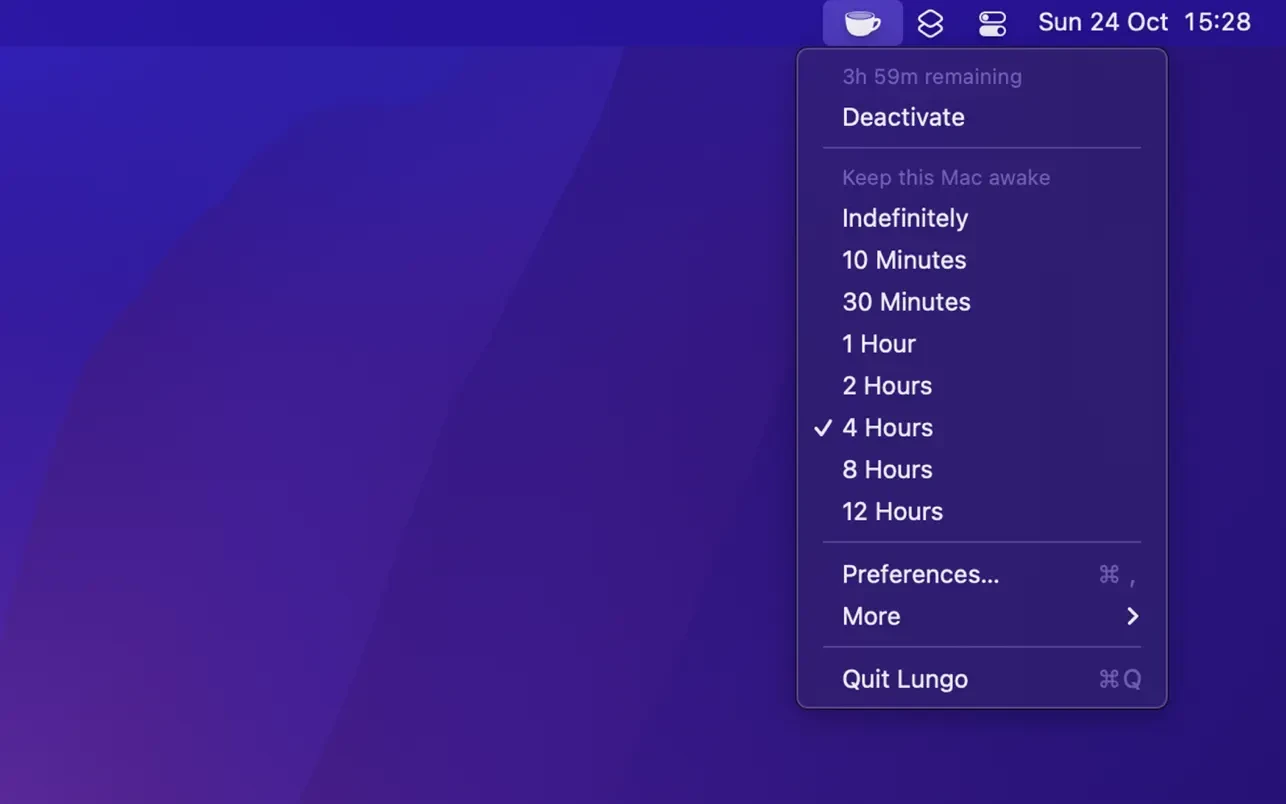 只需在菜单栏中简单点击一下即可开启应用。如果您觉得设定的时间太长,或者希望让您的 Mac 立即恢复睡眠功能,只需再次点击即可关闭——无需等待计时器结束。