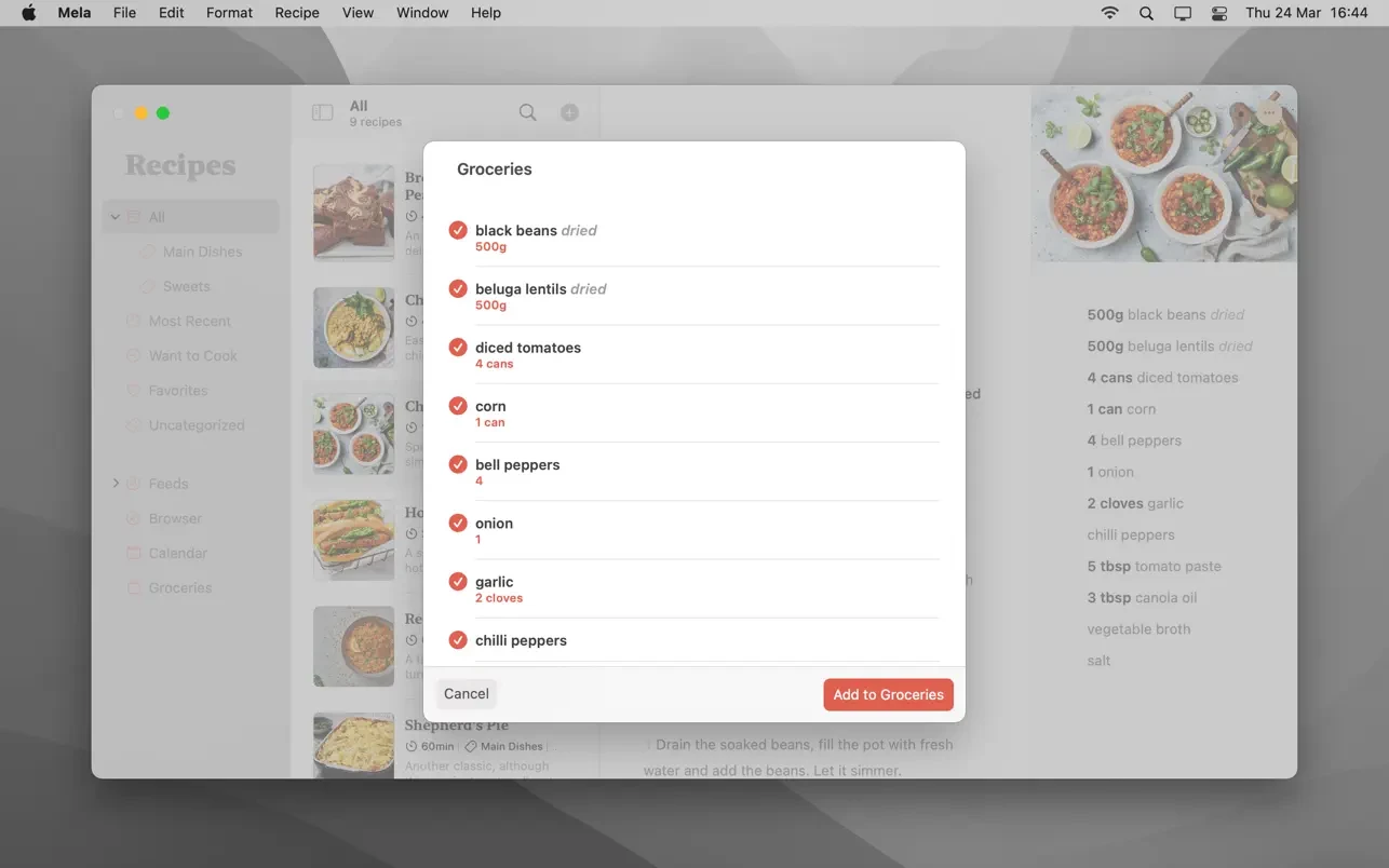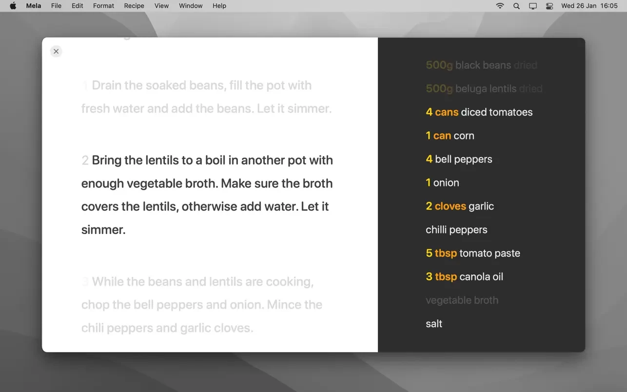 使用文字识别功能,你可以扫描食谱书中的内容,并将其添加到你的个人收藏中。扫描后的食谱可以像其他任何食谱一样,在 Mela 自带的食谱阅读器中查看。