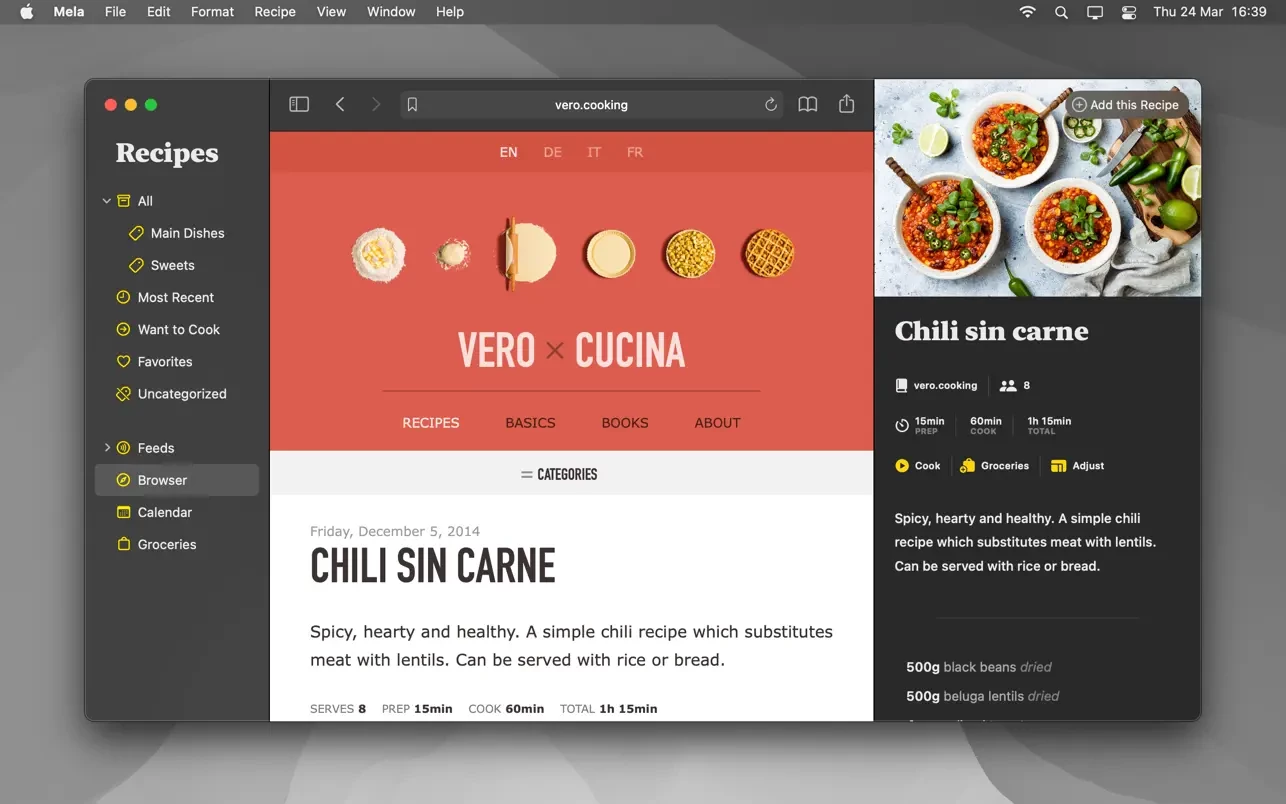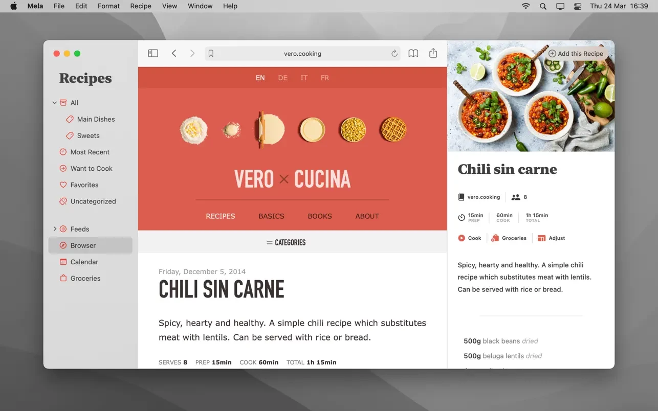 订阅你喜欢的食谱博客,然后可以在 Mela 自带的食谱阅读器中浏览所有食谱。
