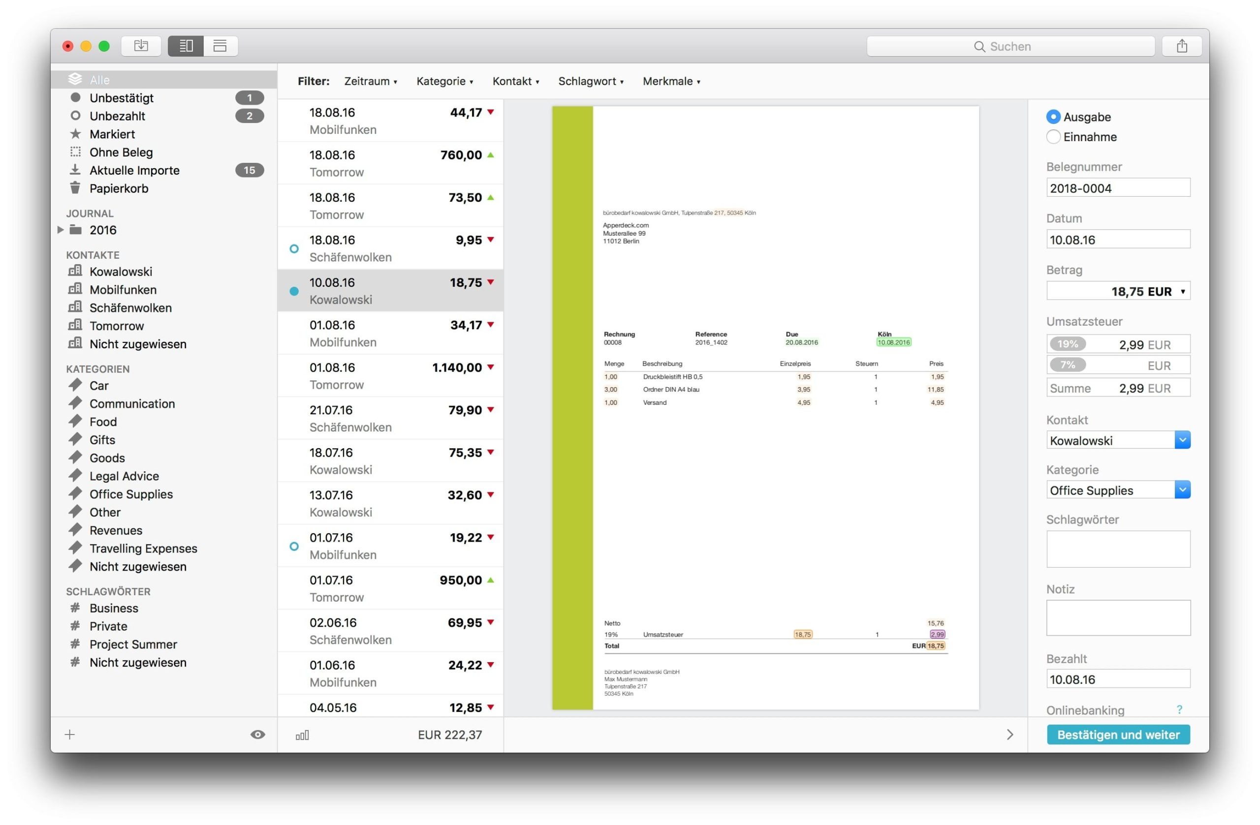 Receipts 是一款理想的收据管理工具,可以帮助您轻松管理税务、费用、会计和家庭收支。该应用能自动识别收据中的金额、日期等关键信息,并能根据联系人和类别进行自我学习分类,从而大大简化您的工作流程。它支持所有常见的文件格式,如 PDF、图片、电子邮件和网页,同时还提供出色的扫描支持。