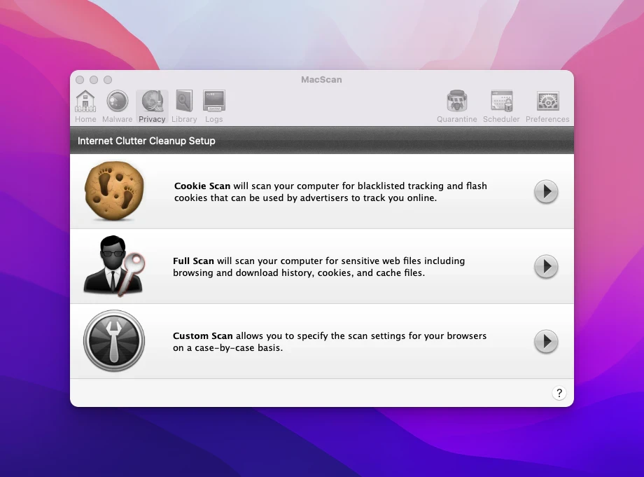MacScan 内置了扫描计划程序,让您可以完全控制自动扫描的启动时间,并能设置不同的扫描任务在不同时间运行。针对跟踪 Cookie,MacScan 的自动清理功能可以在您结束网络浏览后,自动定向并删除黑名单中的跟踪 Cookie,同时保留其他 Cookie,无需用户任何干预!
