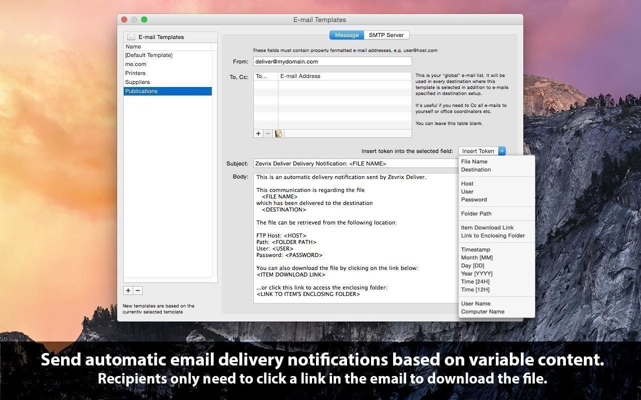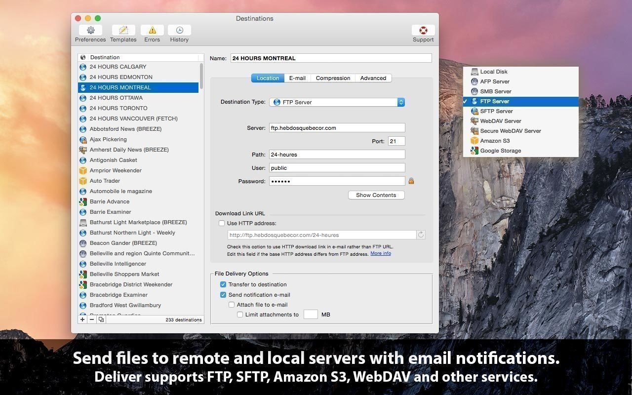 Deliver 是一款全面的文件传输解决方案,支持通过互联网和本地网络发送文件,并提供电子邮件通知功能。它兼容 FTP、SFTP、Amazon S3 等主流服务,并具备自动电子邮件通知、文件压缩、多目的地传输等丰富功能。