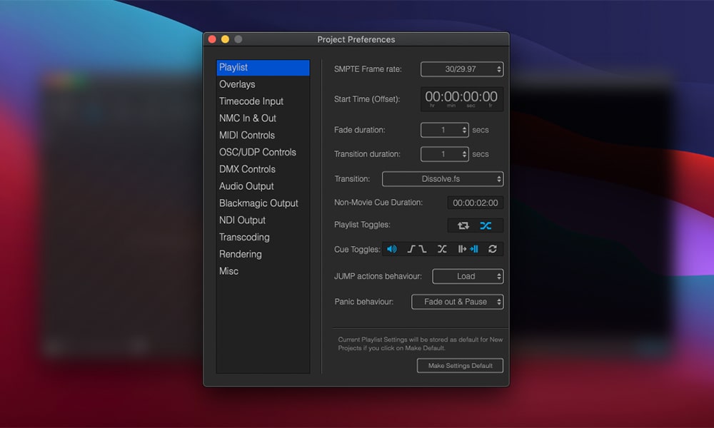 在 Mitti 的播放列表设置中,您可以定义默认的淡入/淡出和过渡时间,以及默认的 **SMPTE 格式**和 **SMPTE 偏移**等。