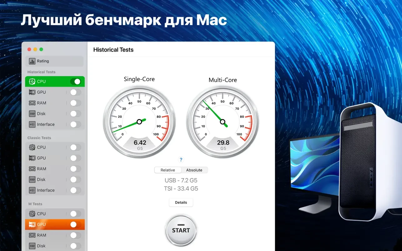 通过我们的应用,您可以了解您的 Mac 相当于多少台传奇的 Power Mac G5。此外,您还可以将您的 Mac 与搭载 Intel 处理器的 Mac Pro,以及采用 Apple 自研 M1 芯片的新款 Mac 设备进行性能比较。