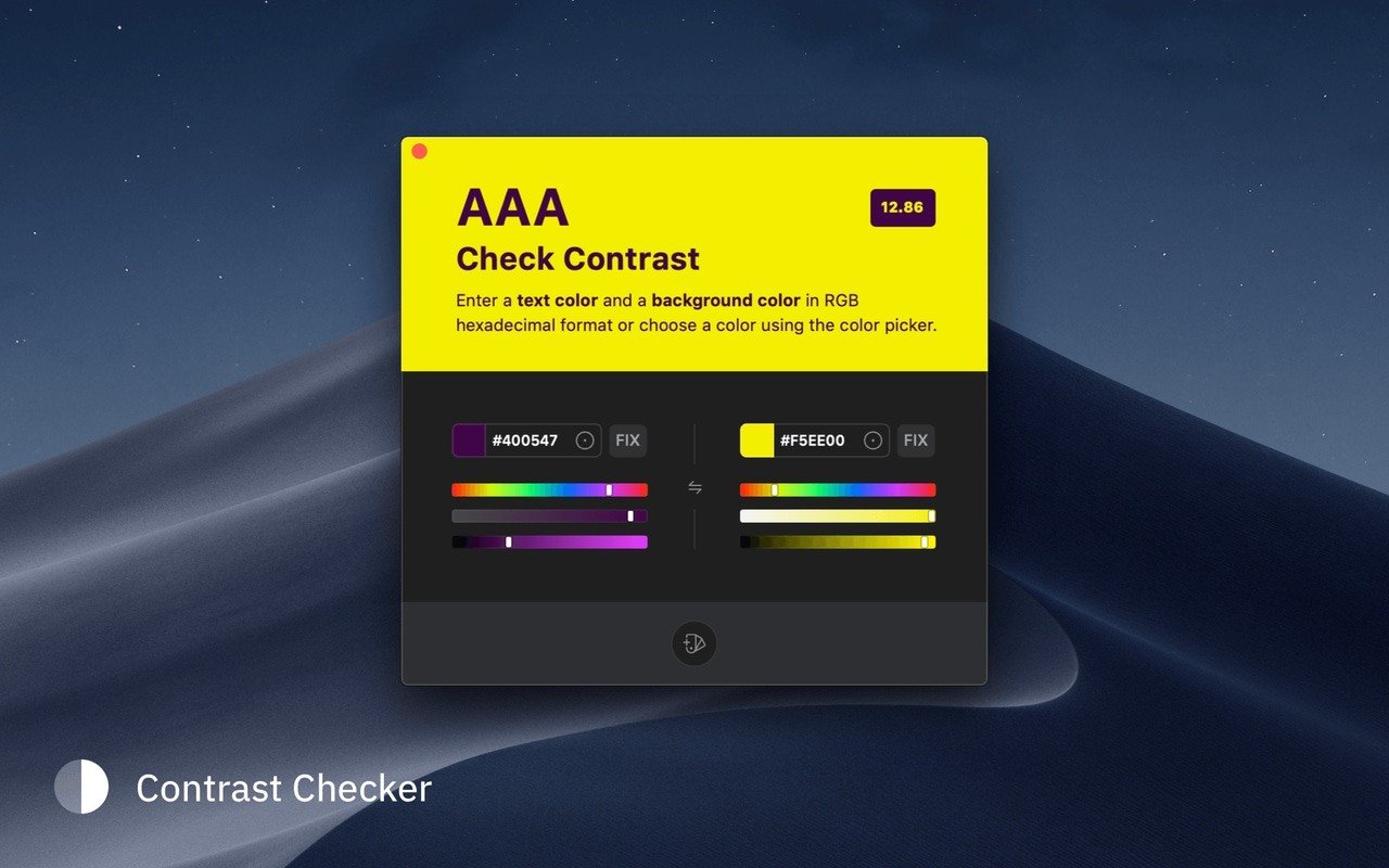 确保文本和背景颜色始终完美搭配。通过 Sip 的对比度检查,您将实现理想的颜色组合。在顶部菜单栏中选择“检查对比度”(Check Contrast),让应用程序扫描组合并获取结果。您可以使用校正按钮自动更改对比度,或者通过调整亮度、色调和饱和度来改善它。