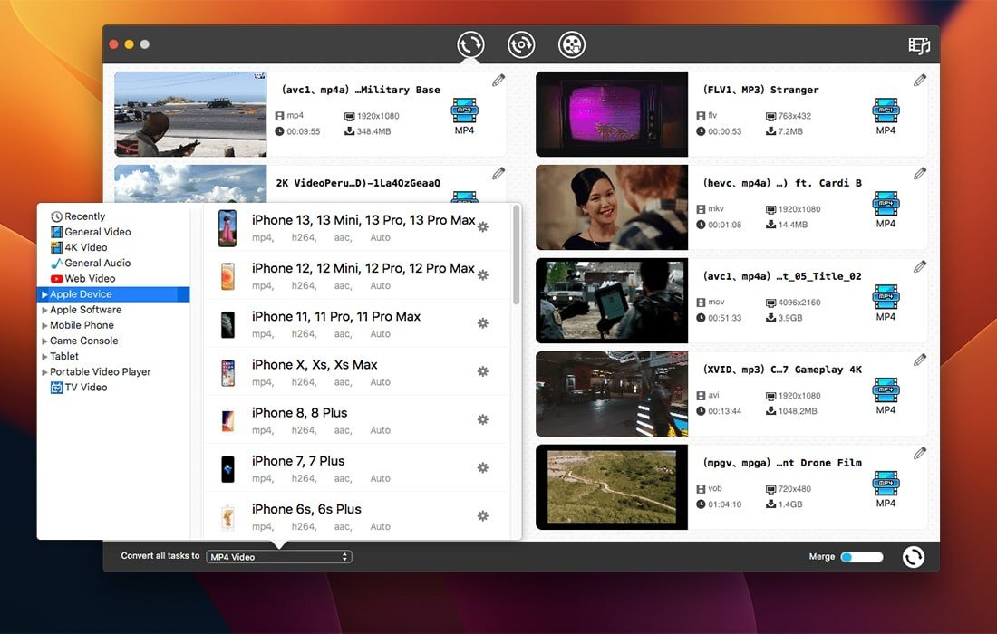 您可从包含 300 多种现成预设的列表中进行选择,这些预设适用于苹果设备、安卓设备、游戏主机及其他设备。程序会自动匹配适合的格式,确保文件能在特定设备上播放。