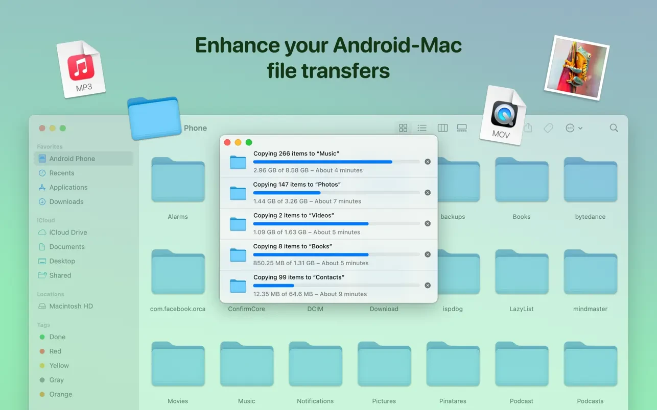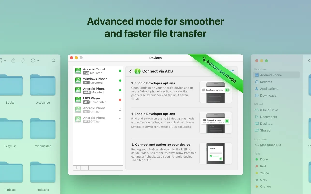 • 可将 Android 设备作为磁盘挂载到 Mac 上