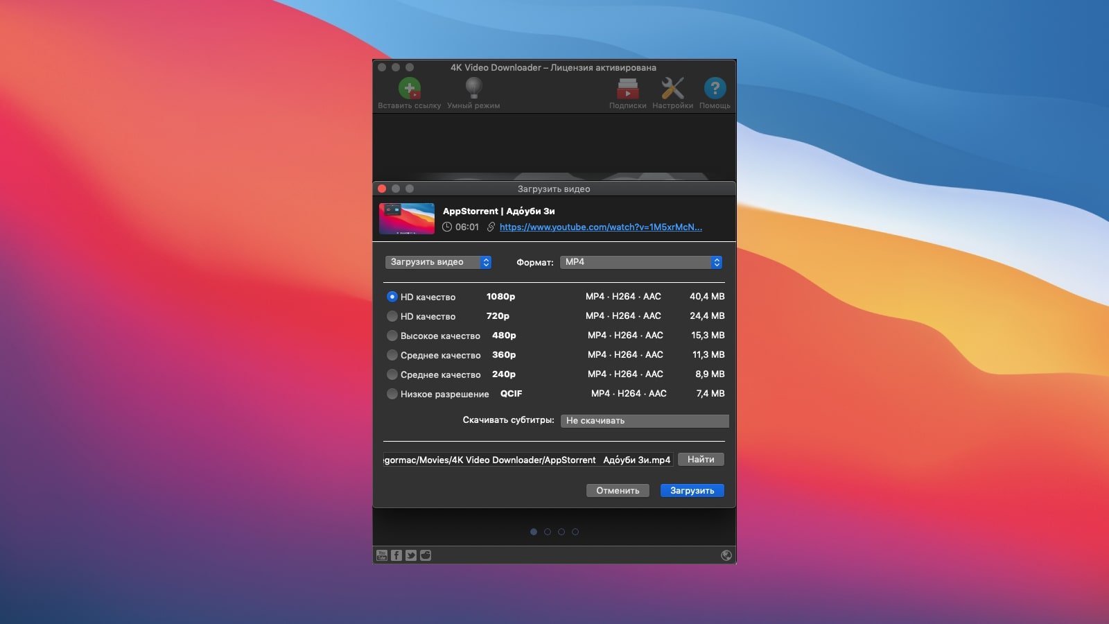 如果需要从不同来源大规模下载几十个视频,但又不需要为每个视频单独设置质量,那么应该使用名为 **Smart Mode** 的“小聪明”。本质上,这是一个包含下载视频参数的模板。在此模式下,只需将下一个视频的链接粘贴到应用程序中,4K Downloader 就会根据预设选项自动完成所有其他操作,包括保存路径。简而言之,这是一键式下载。