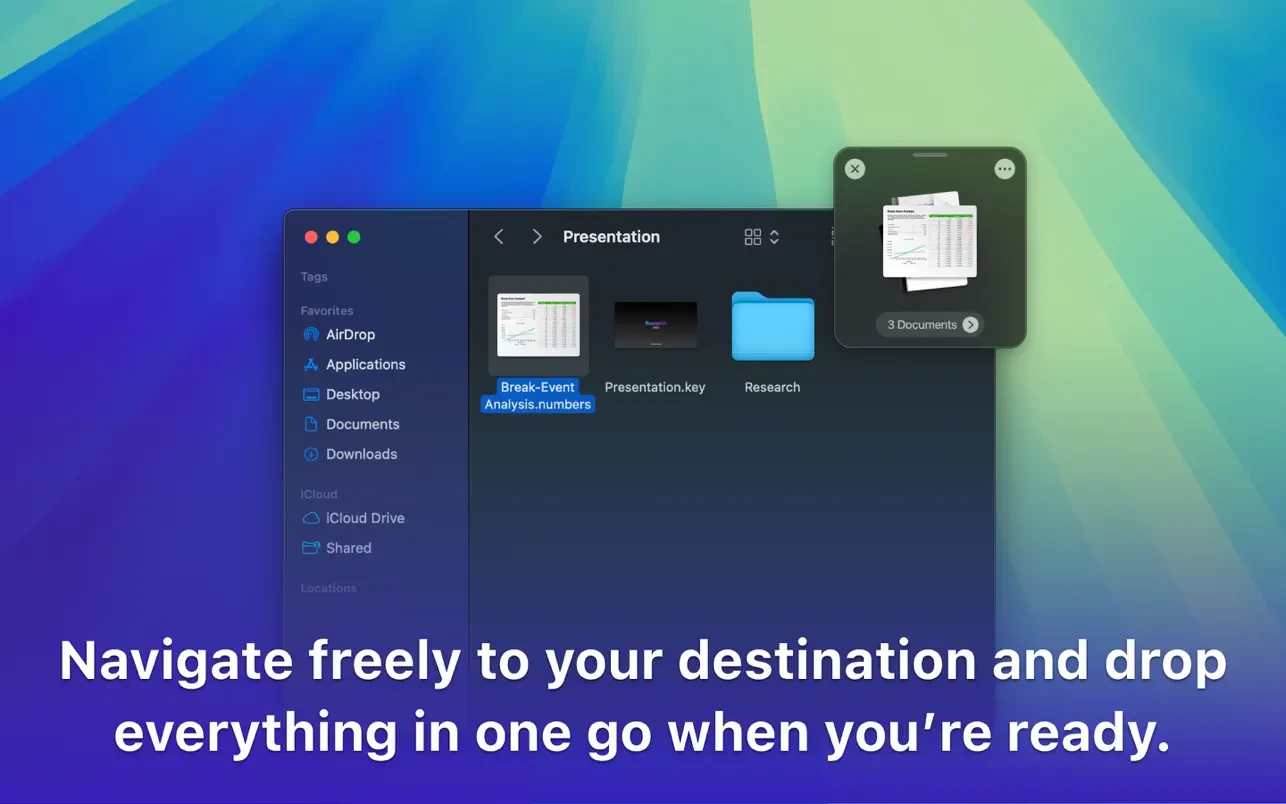 这款程序会在屏幕上创建一个临时的“暂存区”(或称“收集区域”),您可以轻松地将文件拖入其中。这些文件将保留在暂存区内,方便您在处理其他应用程序或窗口时随时取用。