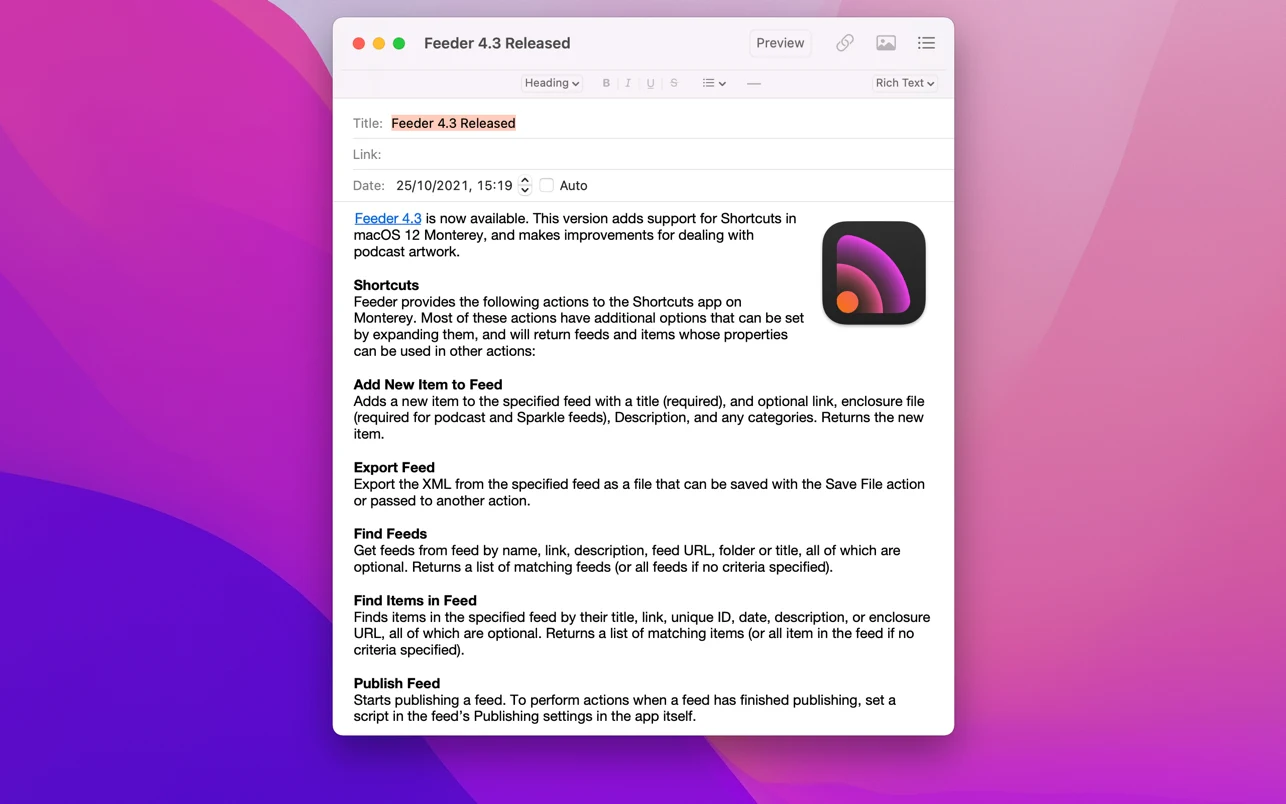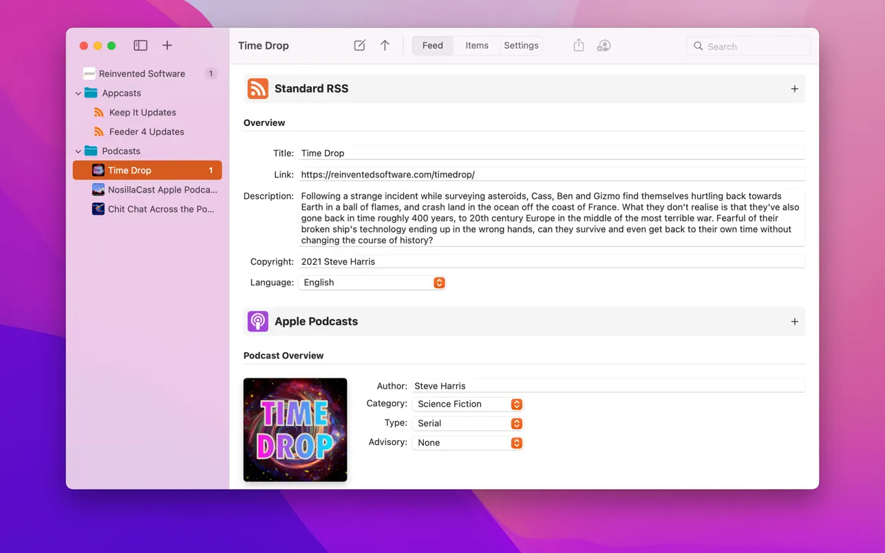 Feeder 是一款功能全面的应用,专为创建、编辑和发布 RSS 播客频道与 iTunes 播客频道设计。