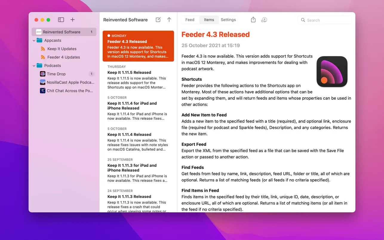 - Feeder 4 已针对macOS Big Sur 系统完成全面更新,同时适配了苹果从 iTunes 到“播客”应用的过渡。