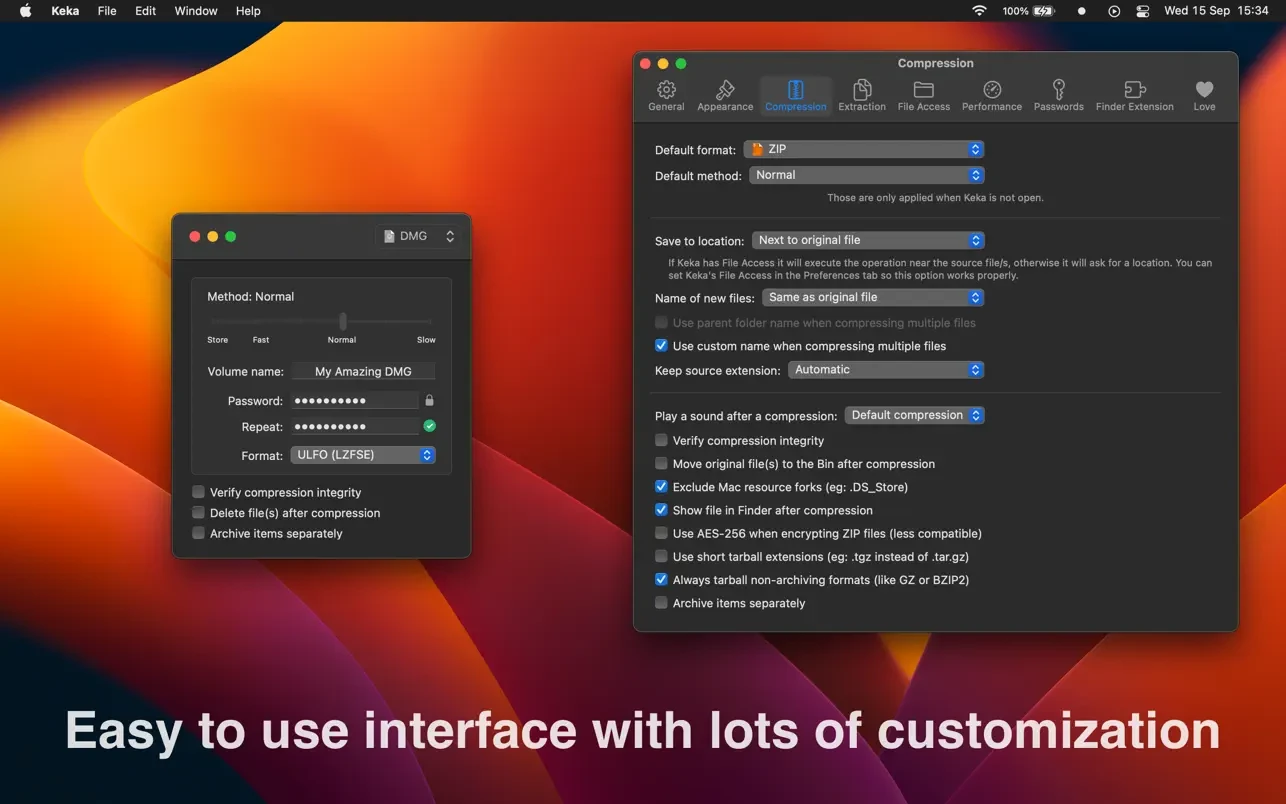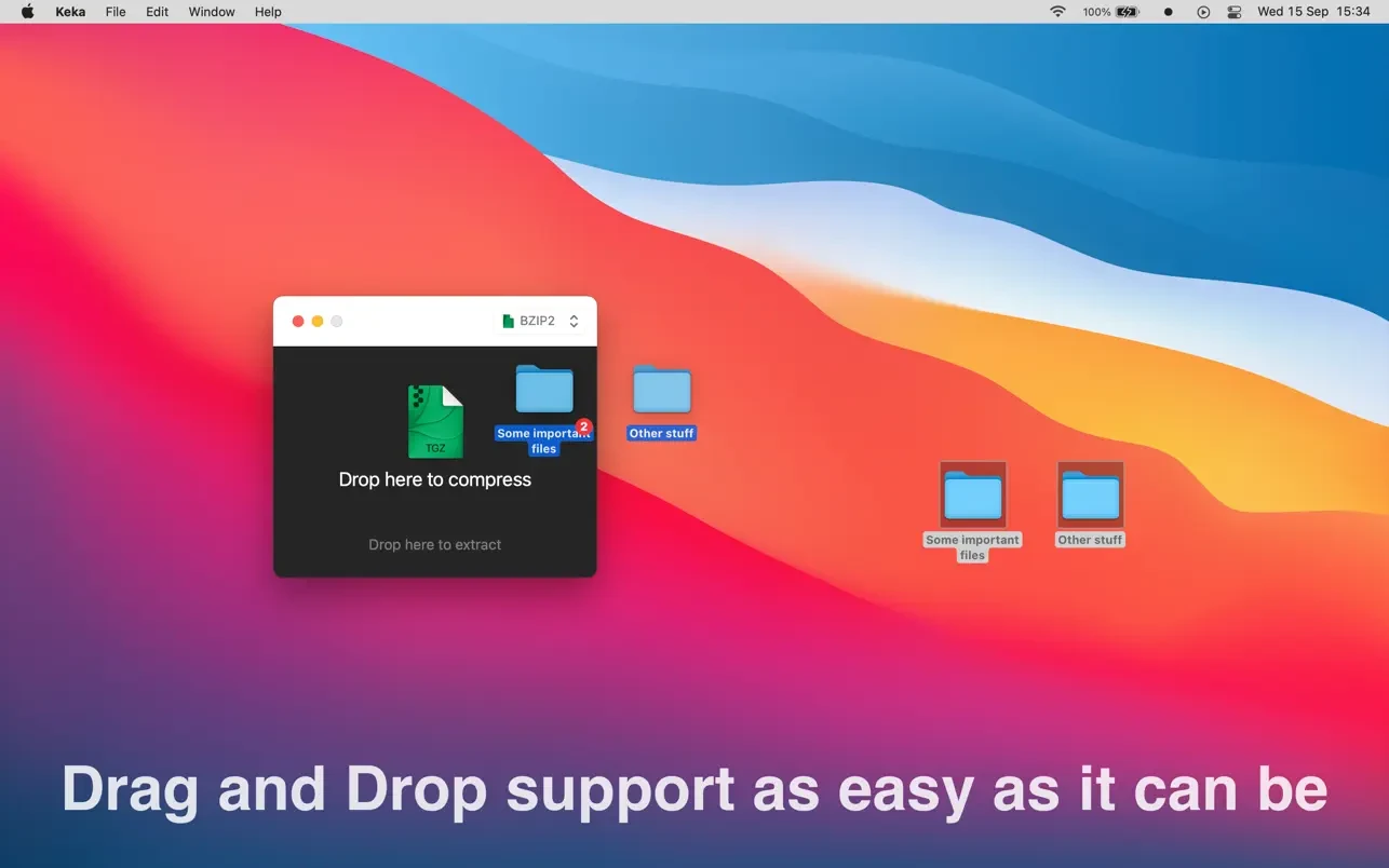用 Keka,你可以将各种文件以多种格式压缩。分割文件和设置密码保护也变得轻而易举。只需将你想要压缩的文件拖放到 Dock 上的 Keka 图标或主窗口中即可。