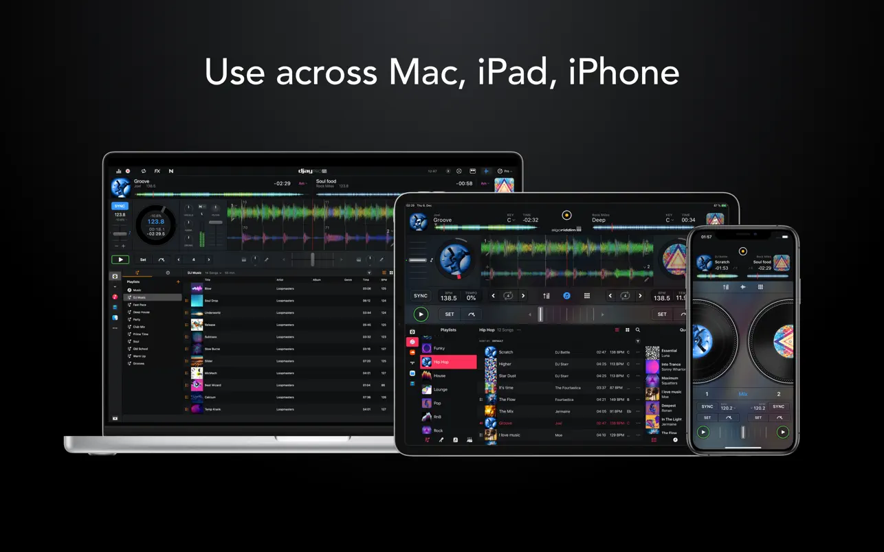 额外的 **PRO 订阅** 允许您一次性订阅,并在所有 Mac 和 iOS 设备上使用 djay Pro AI,包括访问 **NEURAL MIX™**、所有 **PRO 功能**以及 1000 多个循环、采样和视觉效果。