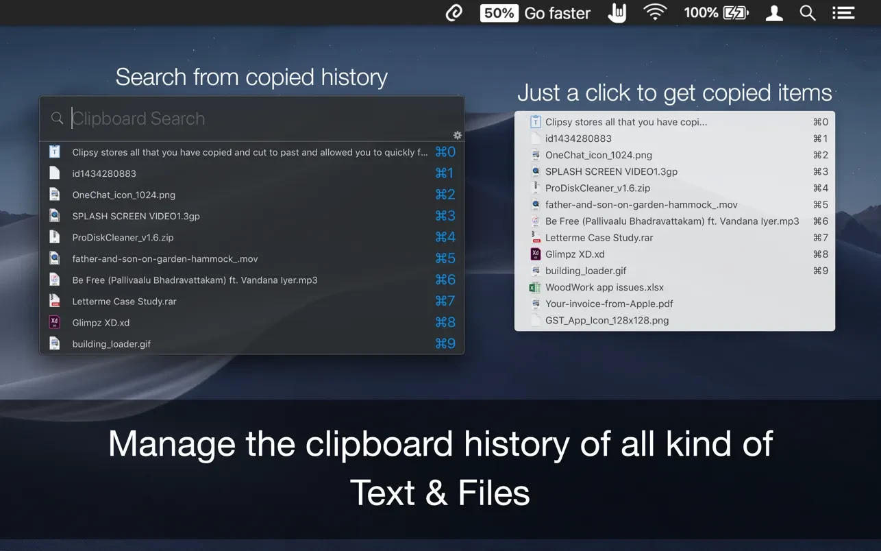Clipsy 是一款功能强大的剪贴板历史记录工具,它能自动保存您复制过的文本、图片、链接、屏幕截图等内容。您可以通过菜单栏随时调取并粘贴这些历史记录,快速找到所需的片段。