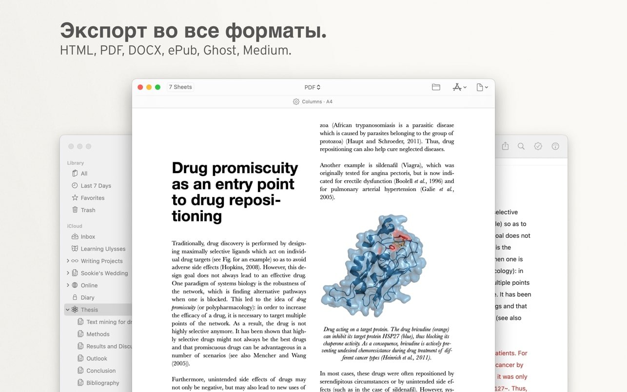Ulysses 会自动保存您写下的每一个字,让您的作品组织起来变得轻而易举。从便条和草稿到最终手稿,所有内容都保存在一个统一的、结构化的资源库中。