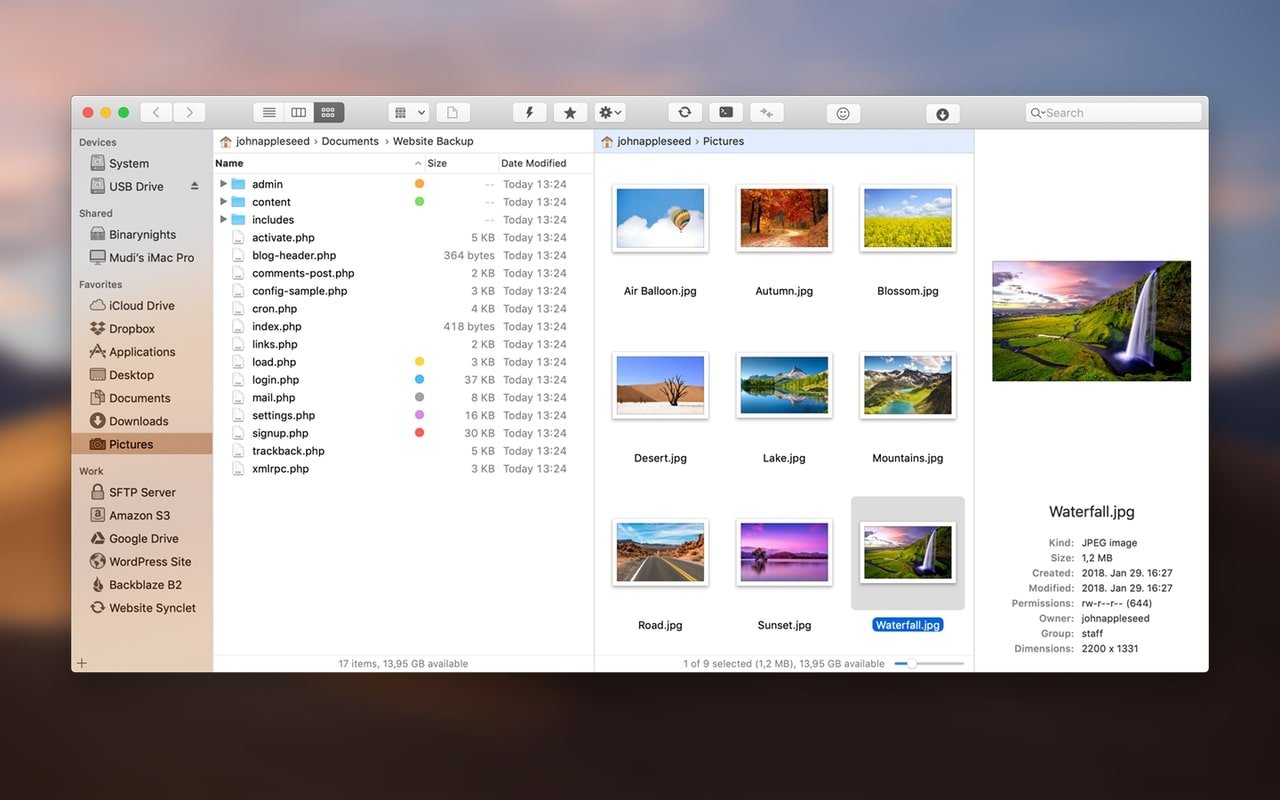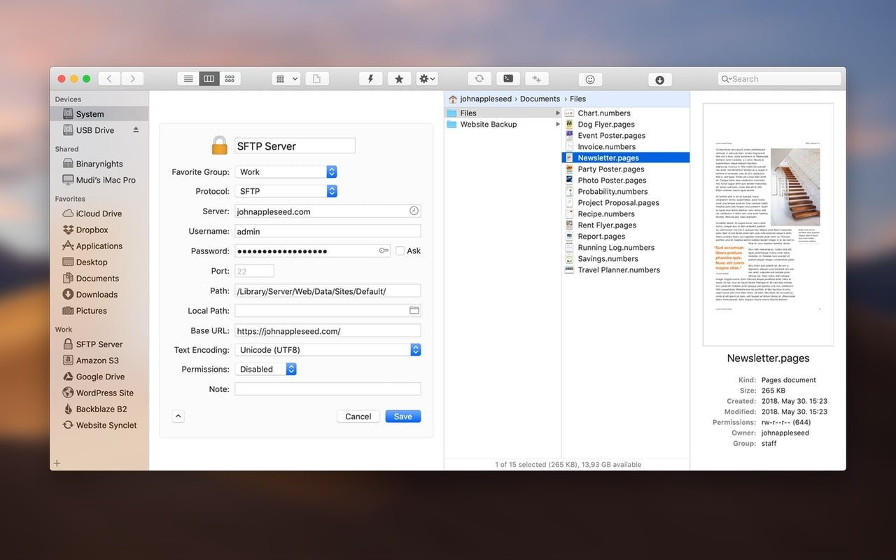 在预览面板中找到所选文件的所有相关数据。查看照片、PDF 和其他类型的文件。在本地和远程服务器上**编辑文本文件**。将 Mac SFTP 客户端设置为**默认文件查看器**,您会发现文件将由它而不是 Finder 打开。