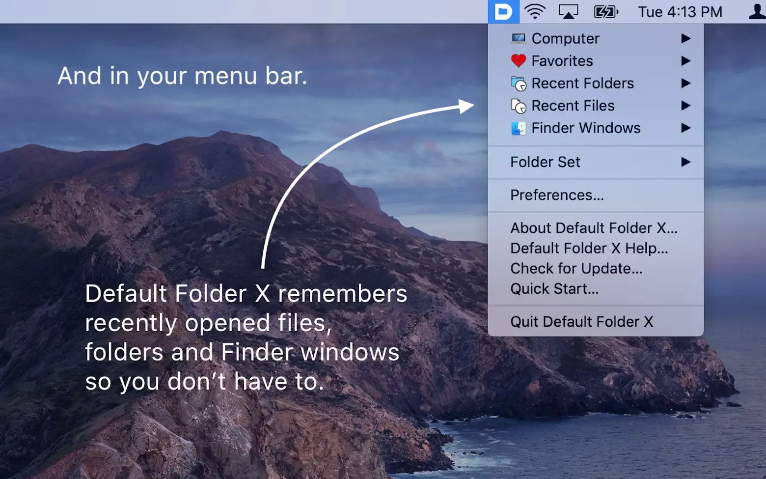 “Default Folder X”的菜单栏图标提供了快速导航至默认文件夹、常用文件夹和最近访问文件夹的选项。同时,该菜单还允许您查看所有已打开的 Finder 窗口,并将其中任何一个窗口置于前台。
