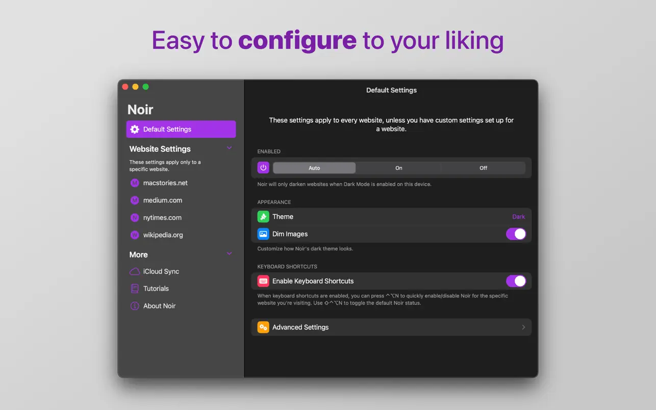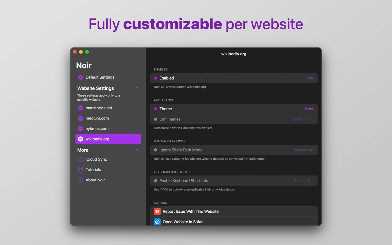 这款应用与您的设备完美融合。作为 Safari 扩展,您**无需**在每次加载新页面时手动激活它。它还**深度集成了系统功能**,例如“快捷指令”,将 Noir 完全融入您的所有工作流程中。您的设置也会通过 **iCloud** 自动在您的所有设备上同步。