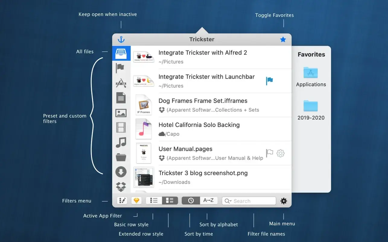 如果您经常处理文件,Trickster 将是提升您效率的理想工具。它可以让您快速访问最近使用过的文档、文件夹和应用程序。所有重要文件现在都触手可及,只需在菜单栏中点击几下即可。