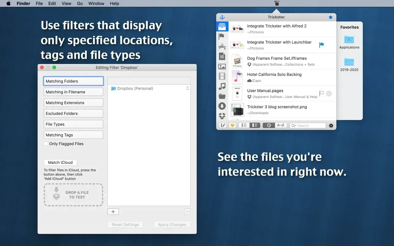 Trickster 会追踪用户在 Mac 上最近使用过的所有文件。有了 Trickster,所有这些文件都可以通过一次点击访问。用户可以随时通过点击菜单栏中的应用图标来获取文件列表,并对文件执行多种操作:打开、预览、移动等等。