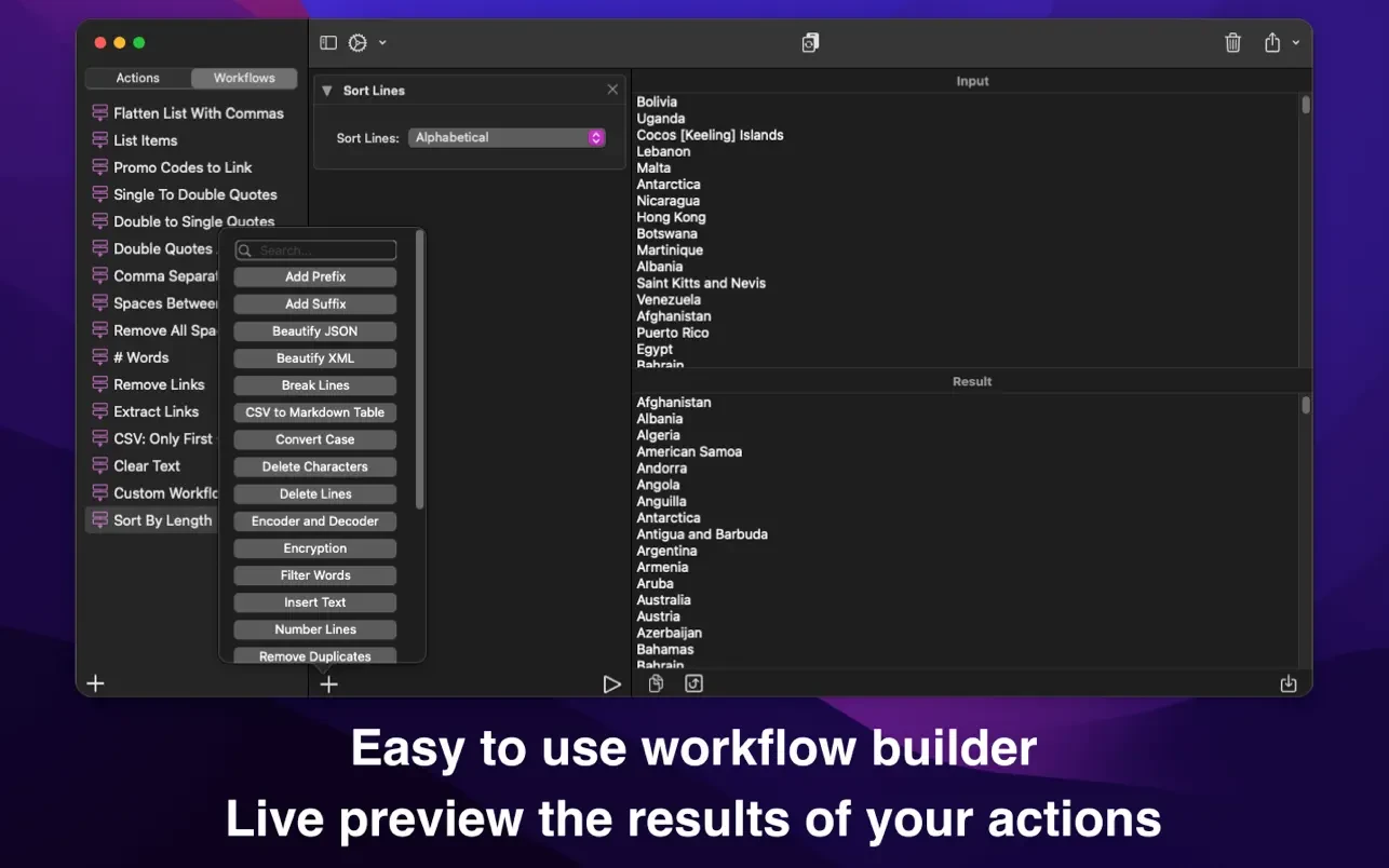 一个强大且易于使用的文本处理工具,可帮助您转换文本。文本工作流消除了手动执行重复性文本任务的需要。