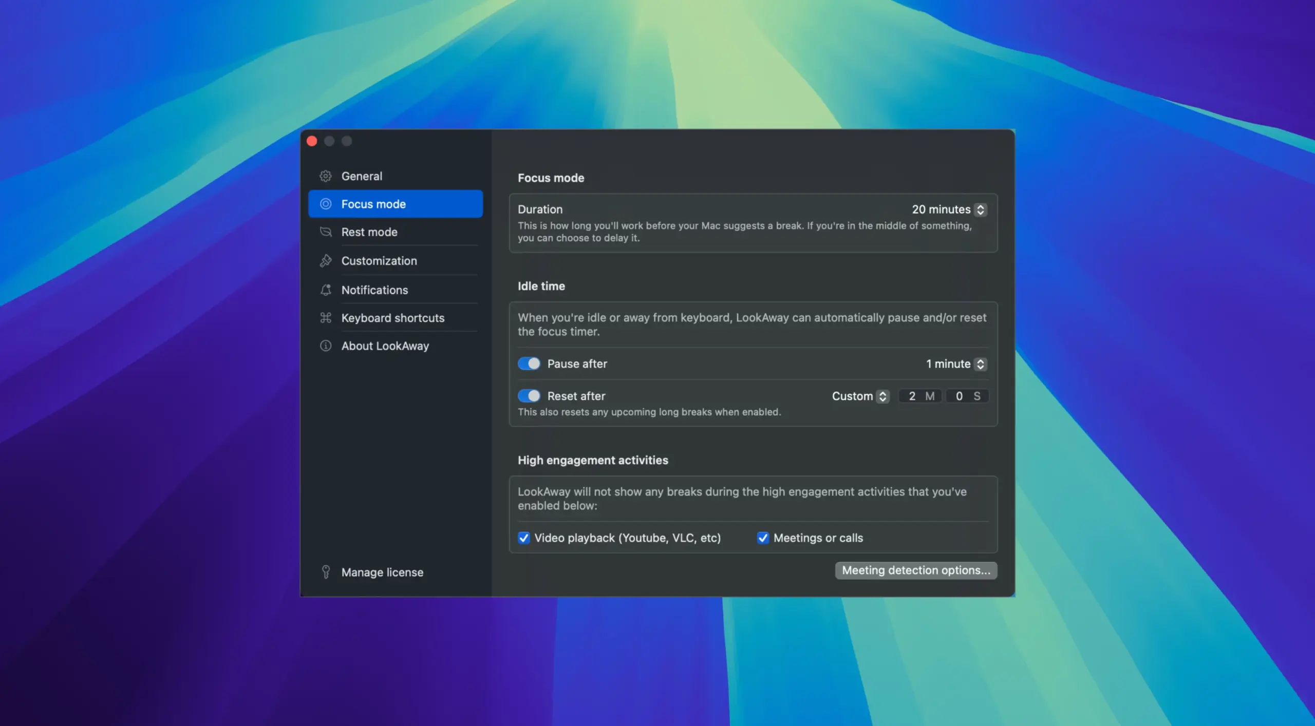 - 自动检测闲置状态: 当用户处于闲置状态时,LookAway 会自动暂停或重置计时器,确保计时准确。