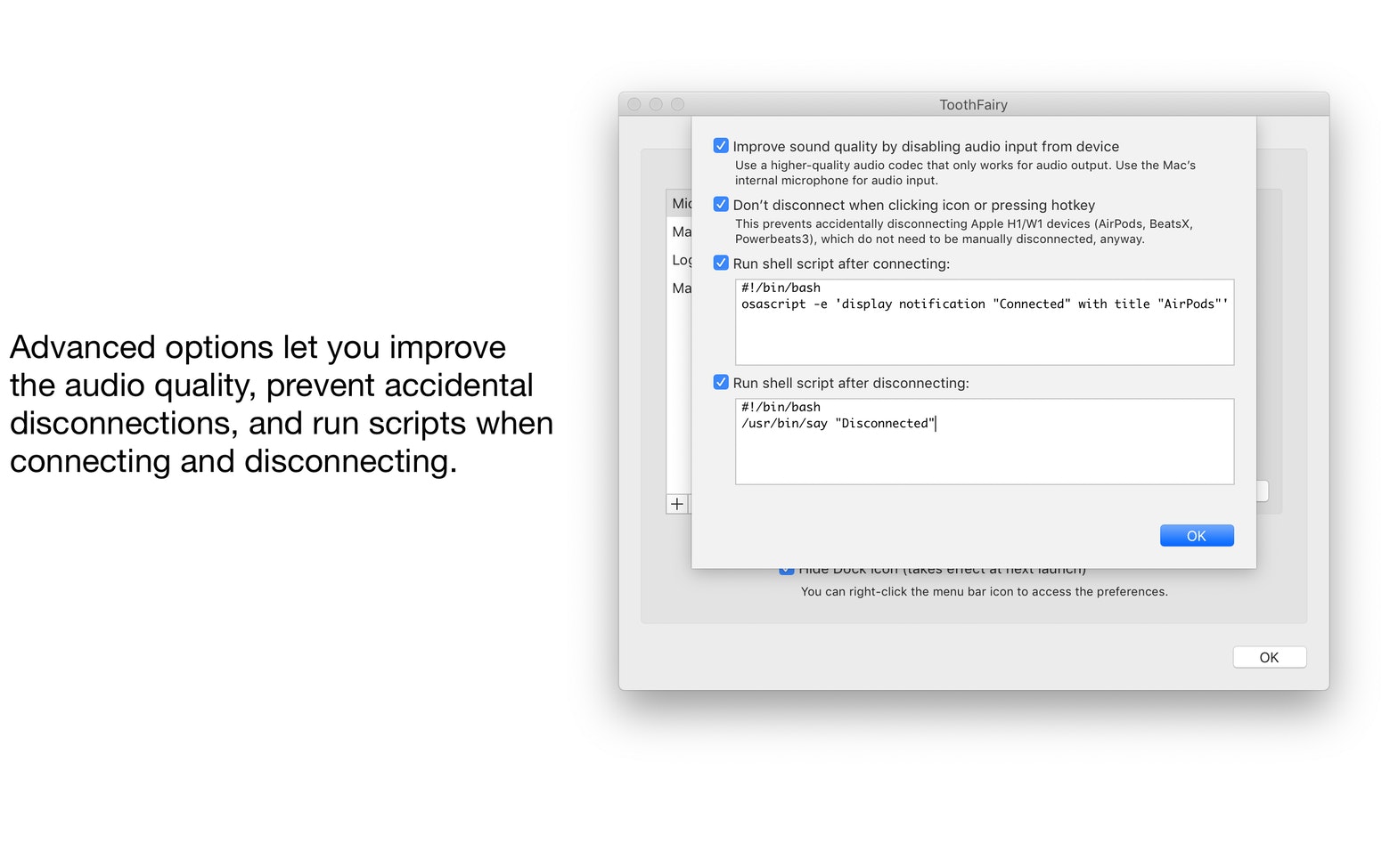 充分利用你的蓝牙设备。ToothFairy 充满了高级功能,可帮助你自定义设置。防止意外断开连接、改善音质,甚至在设备连接或断开时运行自定义的 shell 脚本。例如,当耳机连接时,自动启动你最喜欢的音乐应用。