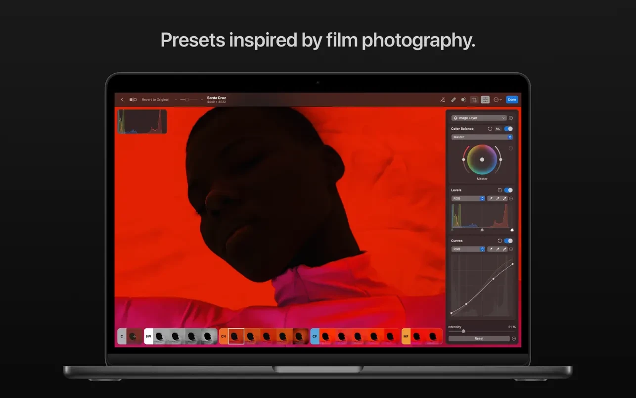 • Регулируйте освещение и цвета с полной точностью, используя настройки «Уровни» и «Кривые».