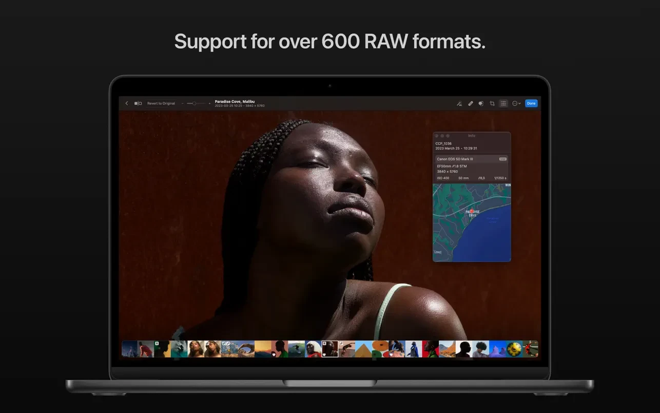 • Открывайте и редактируйте более 650 форматов изображений RAW, включая Apple ProRAW и сжатые файлы Fujifilm RAW.