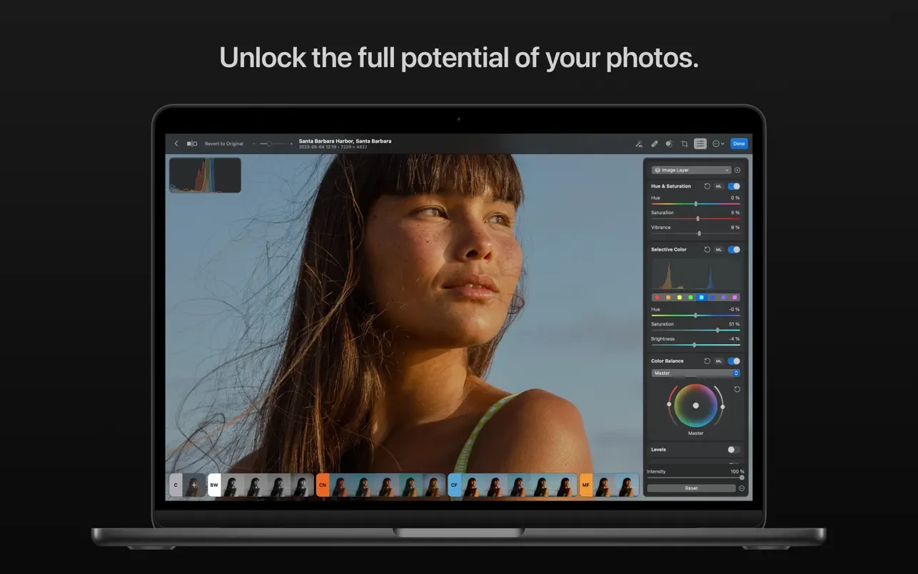 Photomator изначально создан для Mac и легко интегрируется с macOS Ventura. Он использует мощные технологии Apple, такие как Metal, Core ML и Core Image, для обеспечения невероятно высокой производительности даже при редактировании больших фотографий в формате RAW или пакетном редактировании нескольких изображений одновременно.