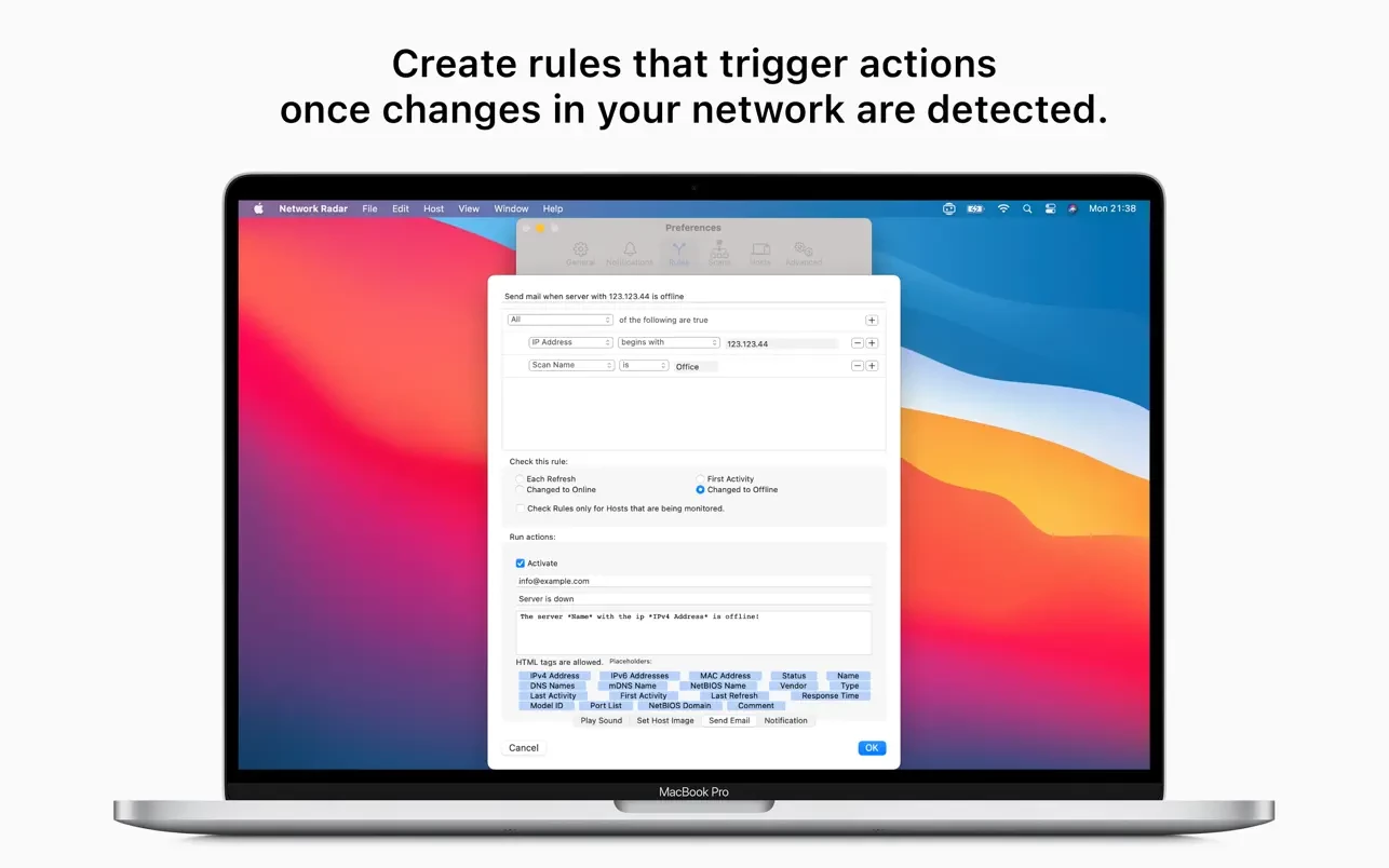 让 Network Radar 监控扫描过程,并实时获取网络变化的更新。所有更改都会被记录在日志中,因此您将始终了解发生的时间和内容。当设备加入或离开您的网络时,您也可以收到通知。通过配置自定义规则和操作,Network Radar 可以在特定服务器离线时向您发送电子邮件,或者在您的网络中出现 FTP 服务器时播放声音。可能的配置是无限的。