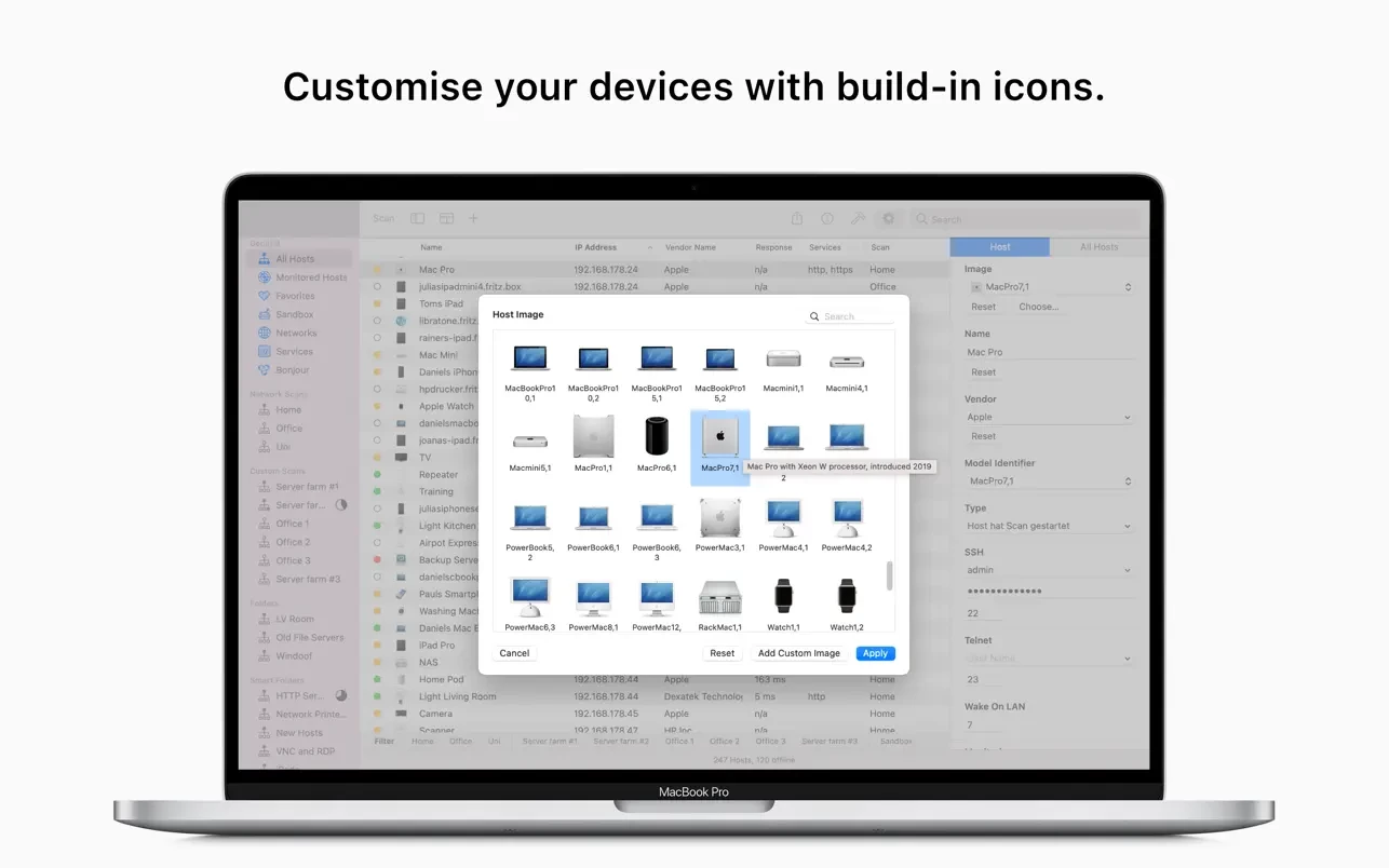 将主机整理到文件夹中。想要将您所有的 iPad 放在一个文件夹中吗?只需创建“智能”文件夹,让 Network Radar 完成所有工作。通过将扫描绑定到网络,Network Radar 始终知道设备是否可用,这使得即使在不同网络中,更新或监控大量设备也变得容易。