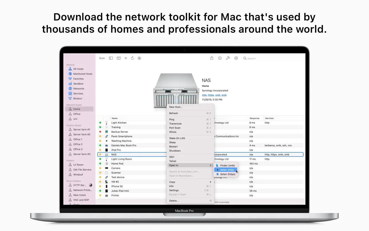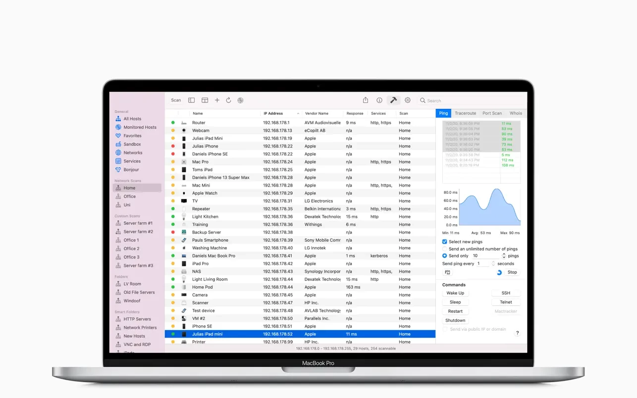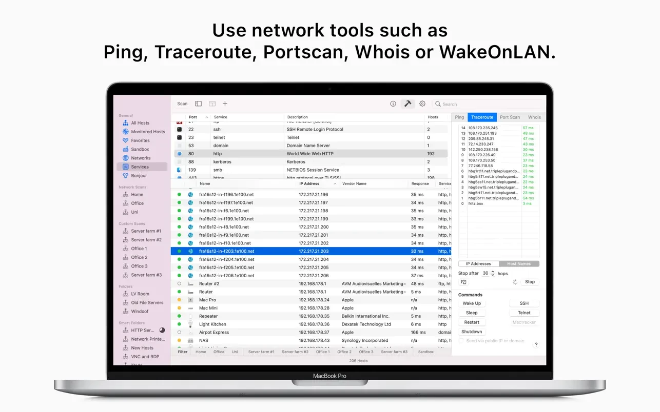 要使用 Network Radar,只需点击“扫描”按钮。无需任何配置。但 Network Radar 不仅仅是一个简单的 IP 扫描器。它内置了有用的网络工具,如 Ping、Portscan(端口扫描)、Traceroute(路由追踪)和 Whois。此外,您只需点击一下按钮即可向您的设备发送命令。对任何支持 Wake On LAN (远程唤醒) 的设备使用该功能,甚至可以远程关闭、重新启动或让其他 Mac 电脑进入睡眠状态,即使它们不在您的本地网络中。