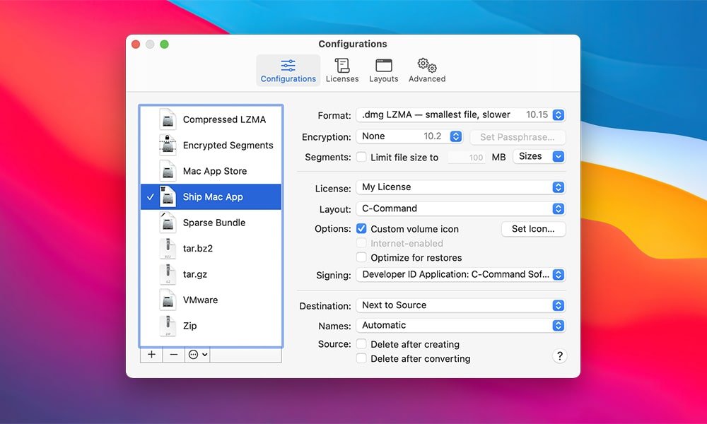 WYSIWYG(所见即所得)编辑器,用于创建分发盘的布局,包括背景、自定义图标、支持多种语言的文本许可协议等。此外,它还支持