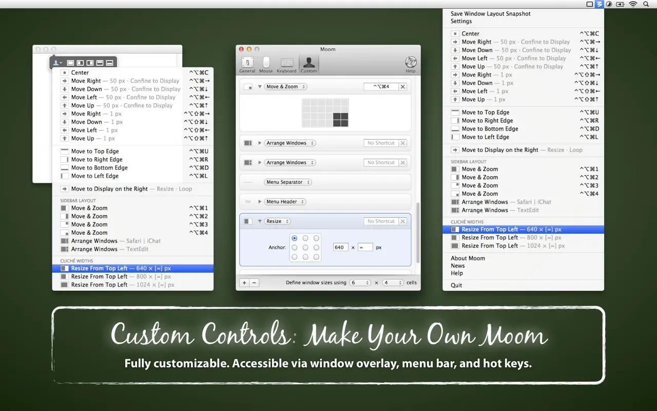 不要以为 Moom 的全部功能仅限于五种固定的窗口尺寸。远不止于此——用户只需在程序设置菜单中启用“**Enable Move & Zoom Grid**”(启用移动和缩放网格)选项,就能通过一个方便的图表表格来自行设定窗口的尺寸和位置,并且操作同样快速。