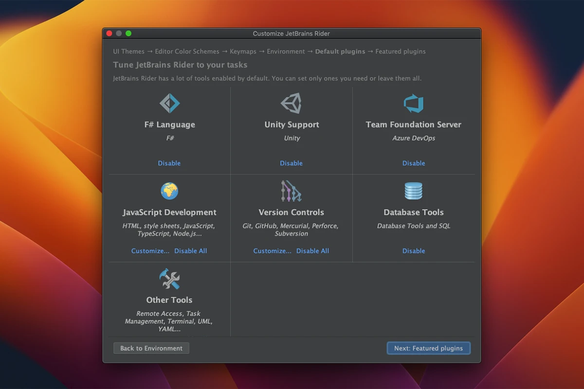 Rider 支持为 **ReSharper** 和 **IntelliJ 平台** 开发的大量插件。内置插件提供了对 **F#**、**Unity** 和 **版本控制系统** 的支持。