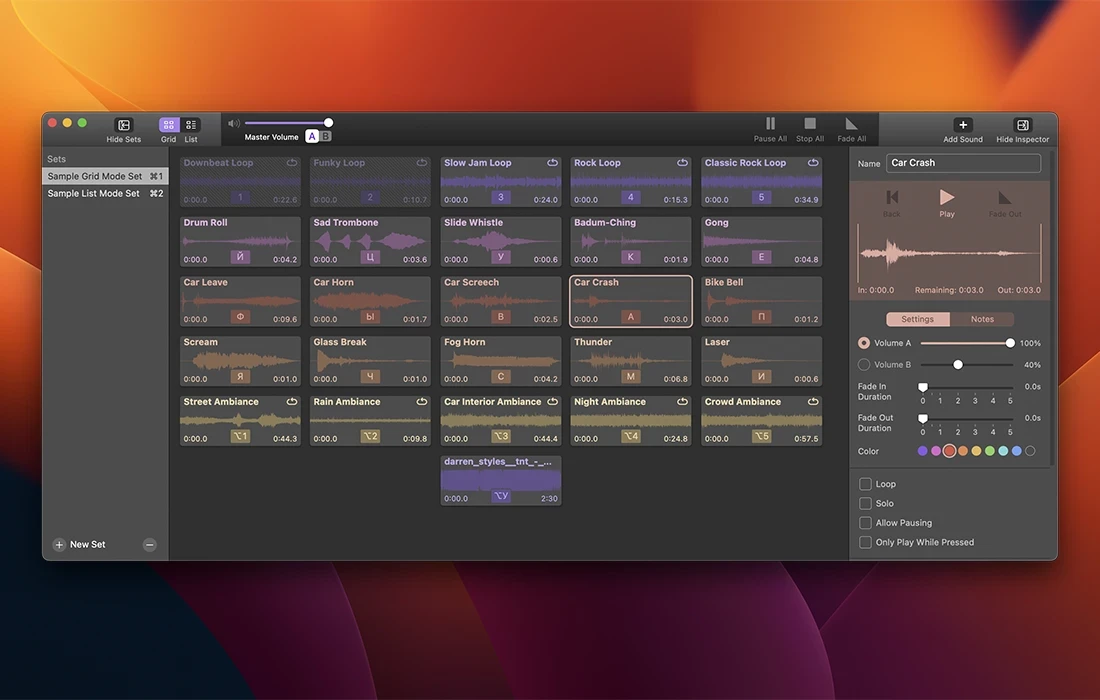 使用检查器根据您的需要自定义每个声音的参数。设置磁贴的名称和颜色,调整入点/出点,更改淡入淡出设置等等。