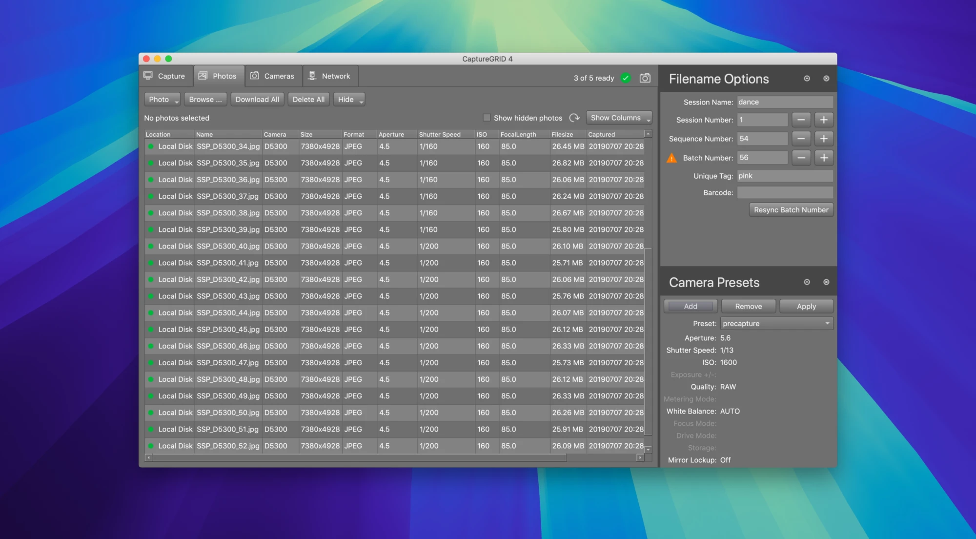 该应用程序可以从一台计算机上完全控制和同步多台相机,包括更改相机设置、触发拍摄、实时取景、自动下载照片以及管理文件名。