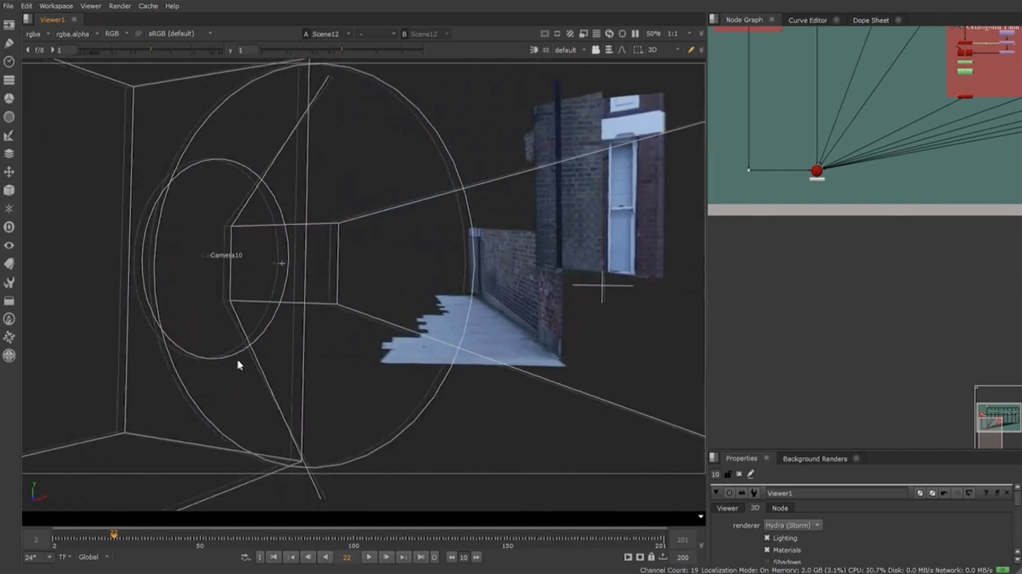 Nuke 的三维工作空间支持 OBJ 格式的对象导入、投影映射、3D 摄影机导入等功能。