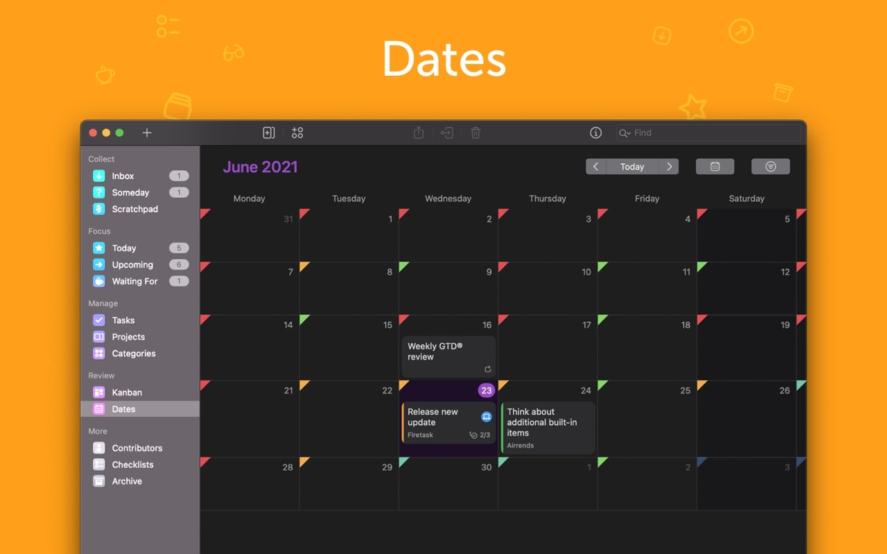 遵循 GTD 的核心阶段:收集、聚焦、管理和回顾,提供简单、符合逻辑的导航。