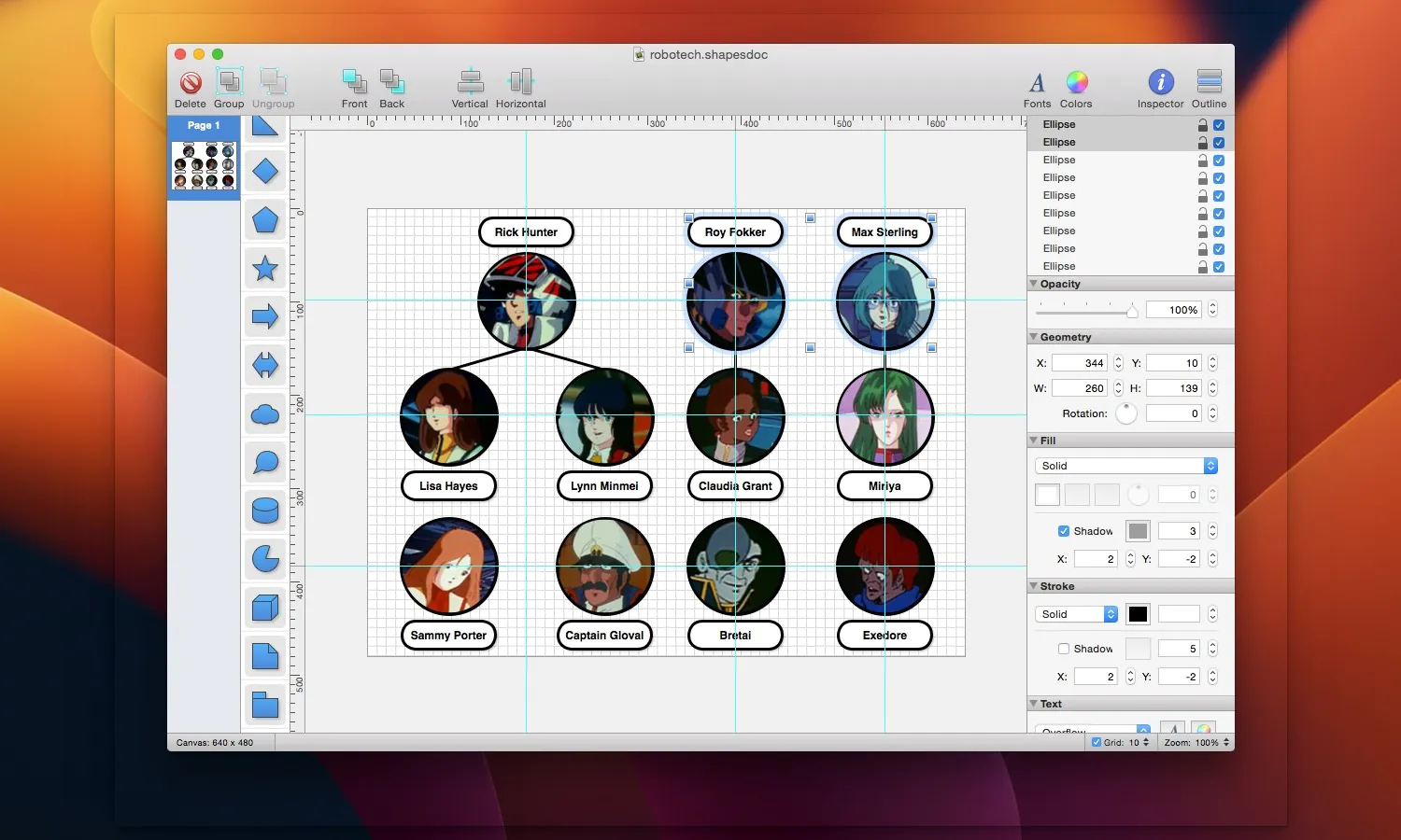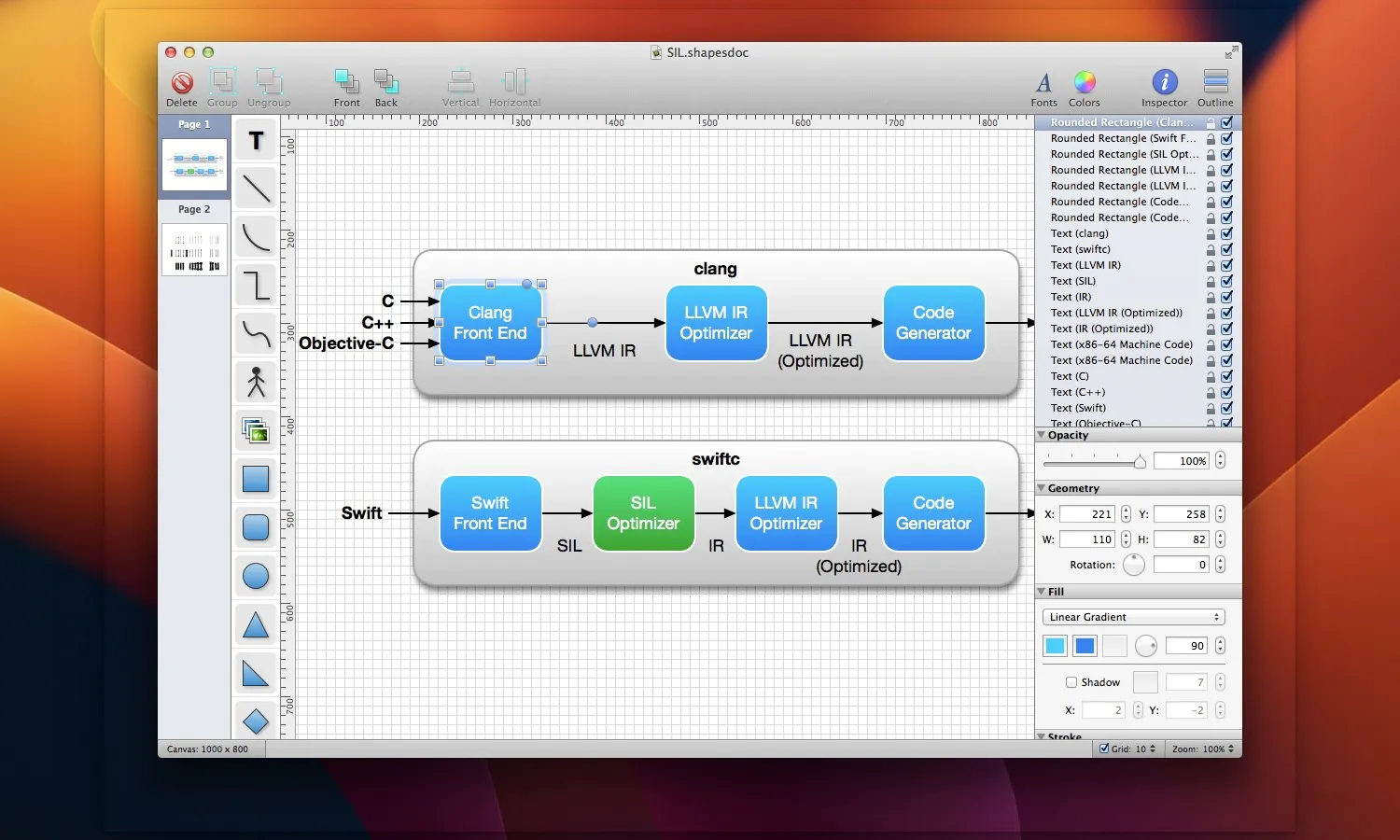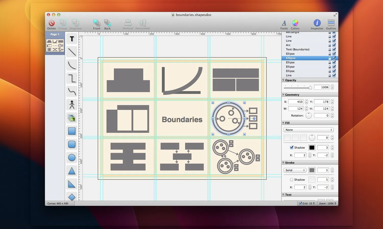 此外,Shapes 完全支持 macOS 的现代功能,如“快速查看”(Quick Look)、全屏模式、自动保存和版本浏览。您可以将作品导出为 SVG 格式,或常用的图像格式如 PNG、JPEG、TIFF,甚至多页 PDF。