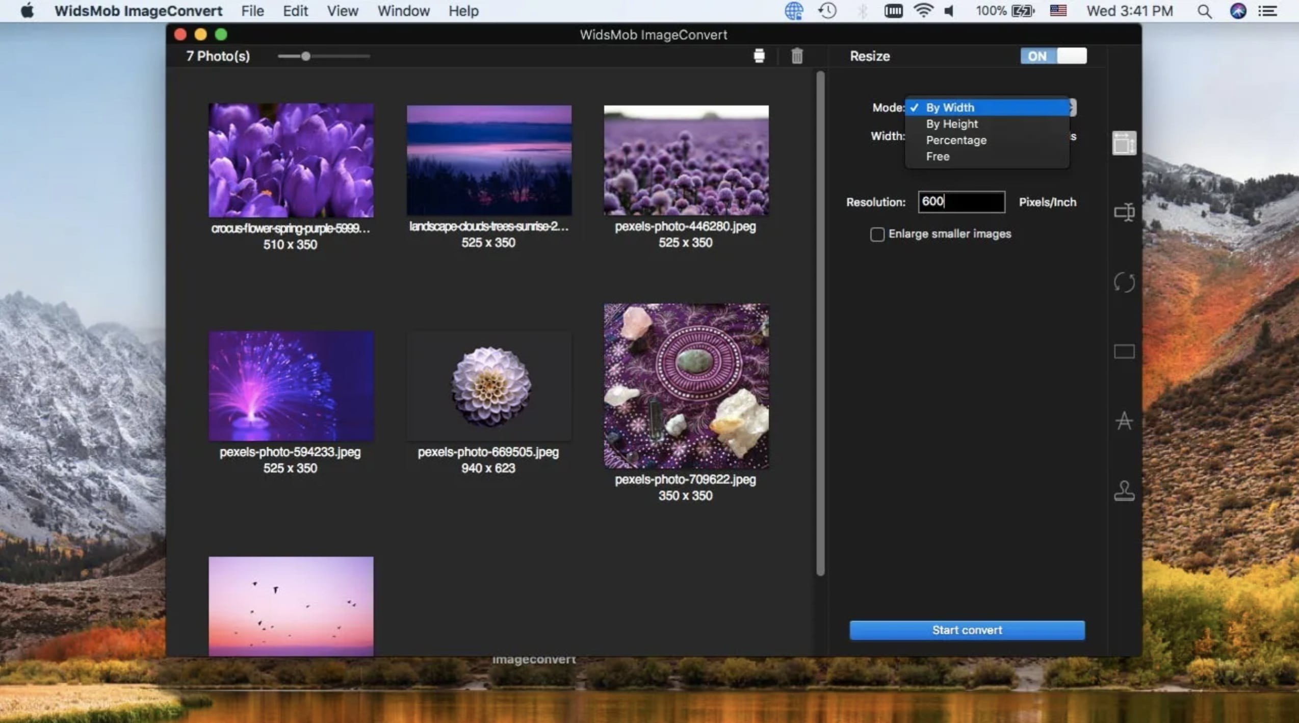 您可以以多种模式调整照片大小:按宽度、按高度或按百分比,甚至可以放大小尺寸图片。您还可以批量旋转图片,添加不同颜色模式的边框或相框。