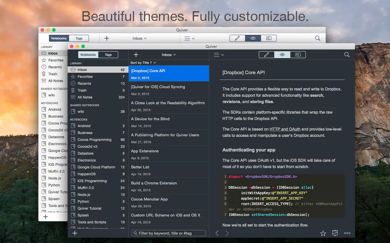 Quiver 内置了多种设计精美的 UI 主题,并且所有主题都可以完全自定义。