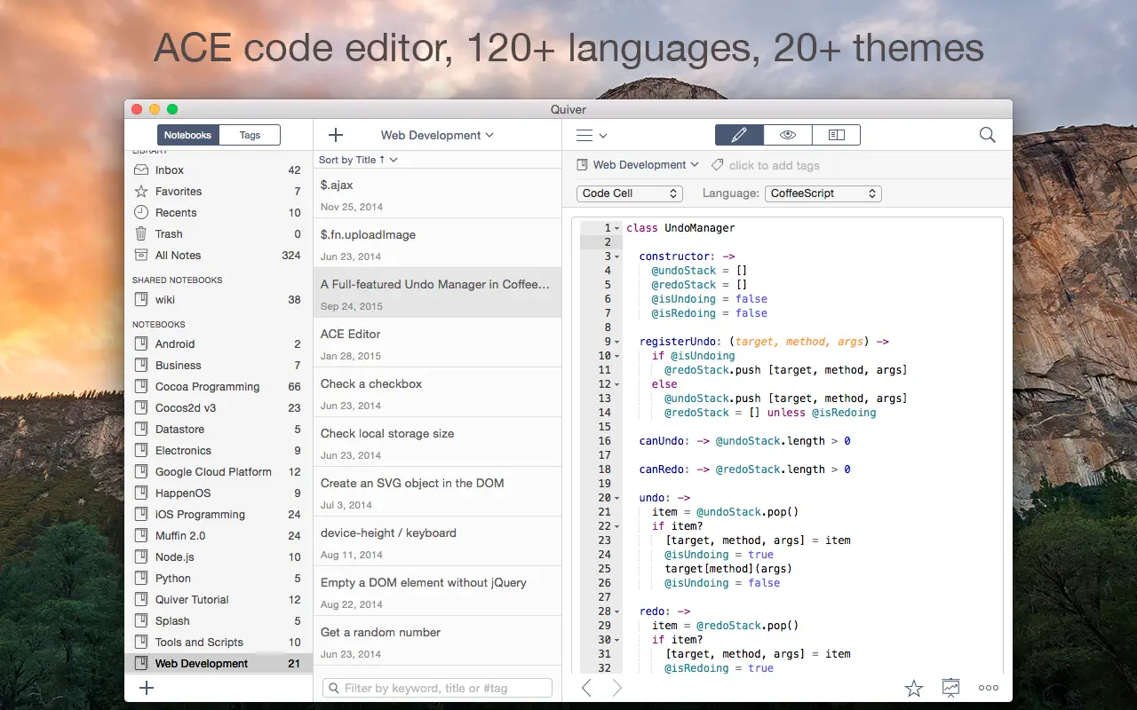 作为一款程序员笔记本,便捷的代码编辑功能至关重要。Quiver 在代码单元格中内置了功能强大的 ACE 代码编辑器,支持超过 120 种语言的语法高亮、20 多种主题、自动缩进等丰富功能。