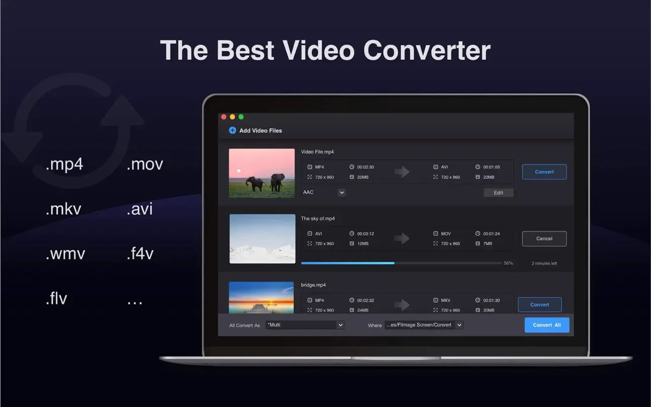 - 视频转换器:将任何视频转换为 MP4、Apple ProRes、MOV、3GP、VOB、MKV、M4V、WMV、AVI、MPG、FLV、F4V、SWF、TS 等多种格式。
