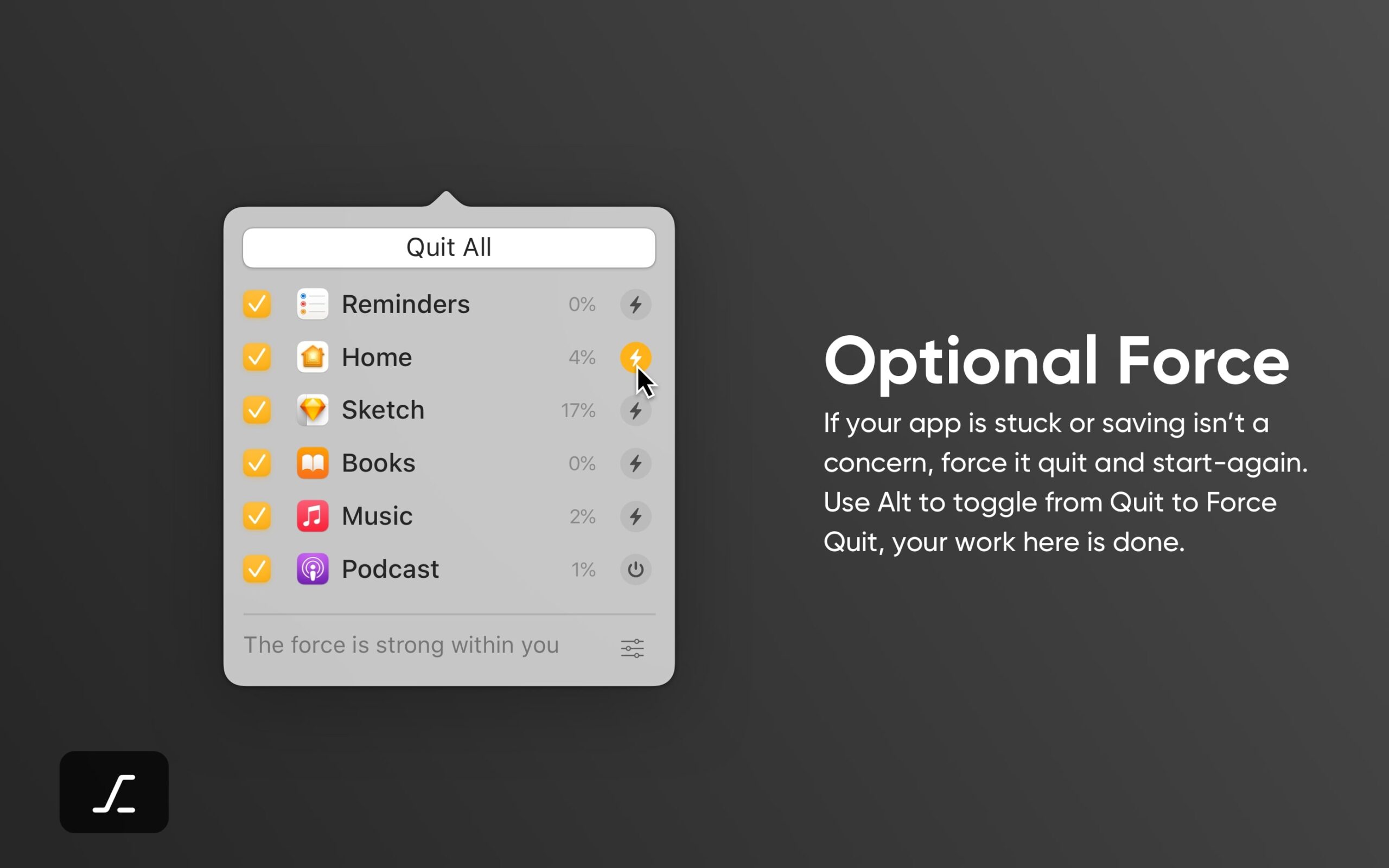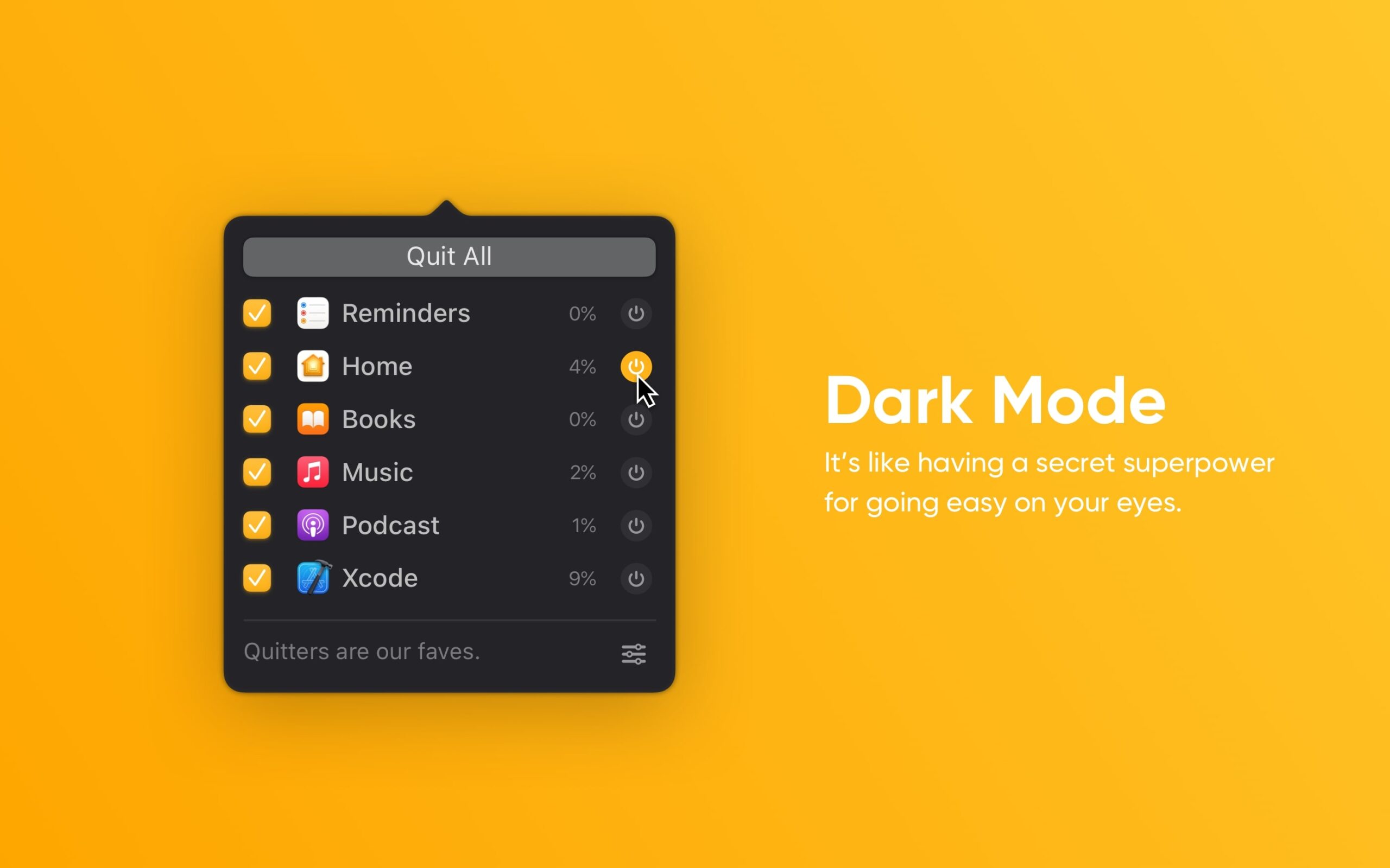 您是否喜欢同时处理多项任务,但又讨厌逐一关闭大量应用程序?或者,您的电脑是否因为后台运行的应用程序过多而变慢?在重启电脑之前,不妨试试菜单栏中的便捷小助手 **Quit All**,来一键关闭所有或选定的应用程序。