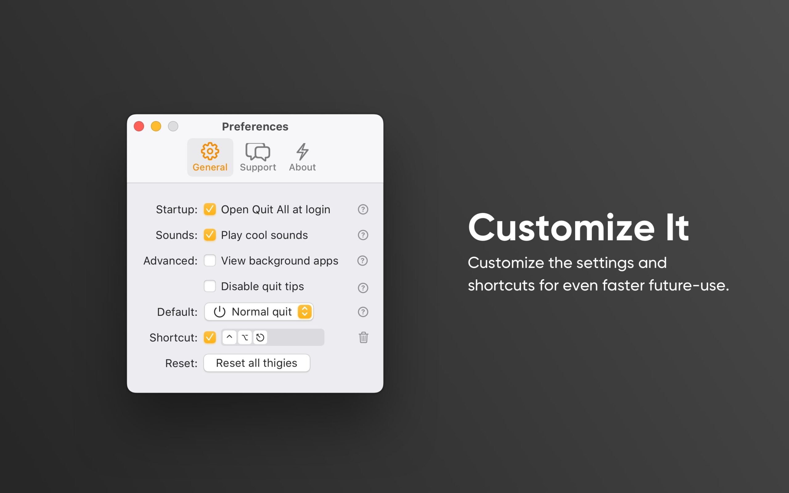 Quit All 提供了深色模式,当您希望菜单栏助手与桌面主题匹配时,可以使用此模式。您还可以根据自己的喜好调整各种应用设置,例如:开机启动、键盘快捷键、默认退出方式、音效等等。
