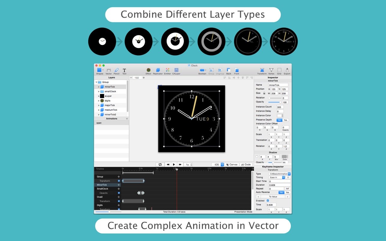 - 即时保存:创建图形和动画,并实时获取Objective C和Swift代码。