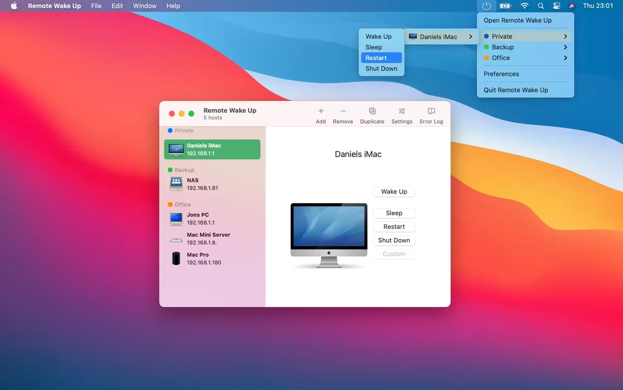 远程唤醒(Remote Wake Up)是一款强大的工具,能够通过局域网远程唤醒所有支持“局域网唤醒(Wake On LAN)”功能的设备。它甚至支持通过互联网远程唤醒设备。此外,您还可以使用SSH远程重启、关机、睡眠其他 Mac 电脑,甚至发送 AppleScript 脚本来执行更多操作。