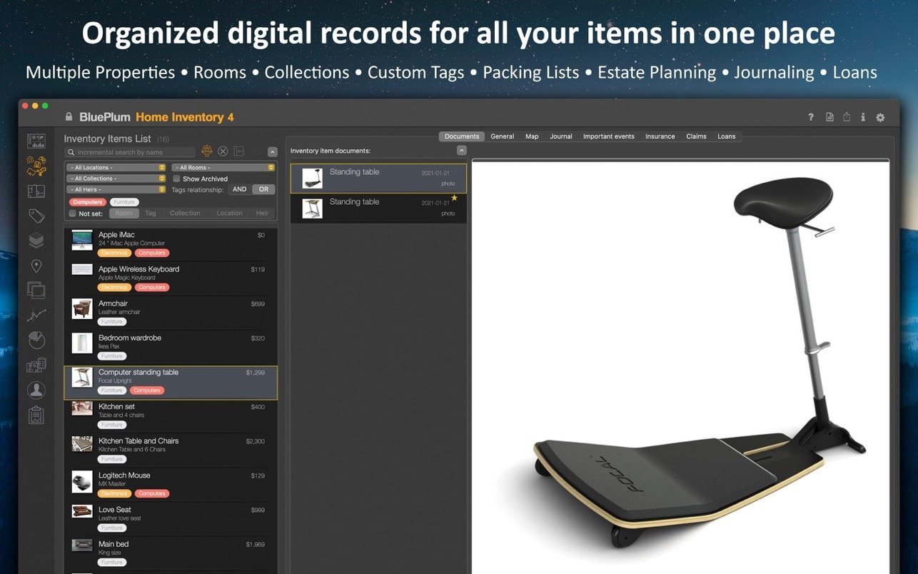 - 为每个物品添加所有必要的信息:名称、描述、年份、品牌、型号、序列号、购买价格、年折旧率、继承人、保修等。